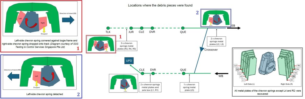 The stalled train came to a stop on Ulu Pandan Depot’s eastbound reception track. Four wheels of T310’s Car 2065’s front bogie were found to have derailed and come off the running rails. The axle box of Car 2065 was missing and was later recovered near Dover station.