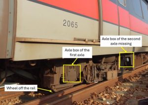 The axle box that failed was on the third carriage of the six-car train. This was identified as train car 2065. The middle carriages of NSEWL trains are motor cars, meaning that these bogie wheels are driven by an electric traction motor.