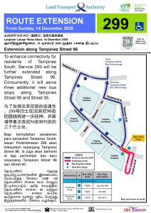 Bus Service 299 provides residents at Tampines North, Tampines Street 95 & Tampines Street 96 with greater connectivity to Tampines MRT Station, along with other amenities in the neighbourhood.