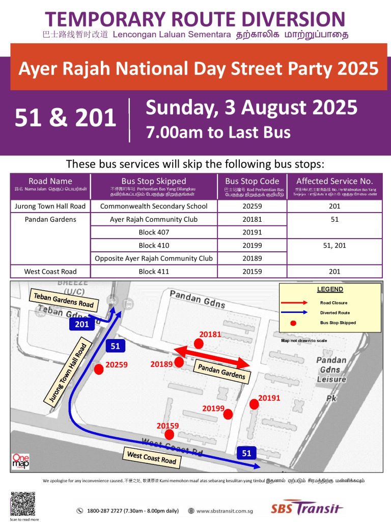SBS Transit Temporary Route Diversion Poster for Ayer Rajah National Day Street Party 2025 SBS Transit Temporary Route Diversion Poster for Ayer Rajah National Day Street Party 2025 SBS Transit Temporary Route Diversion Poster for Ayer Rajah National Day Street Party 2025