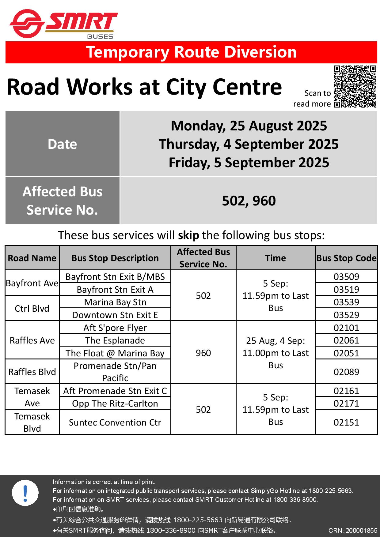 SMRT Buses Temporary Route Diversion Poster for Road Works at City Centre (Aug/Sep 2025)
