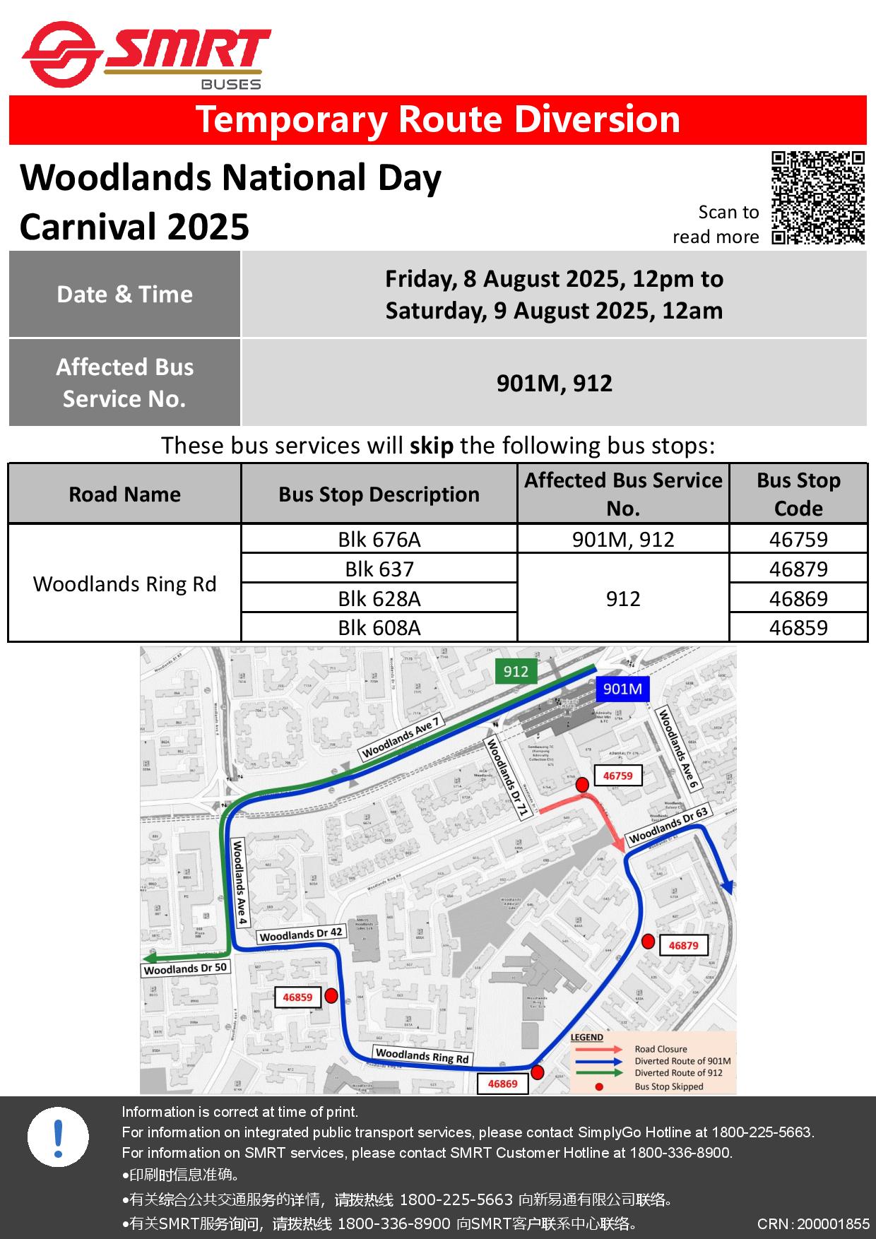 SMRT Buses Temporary Route Diversion Poster for Woodlands National Day Carnival 2025 SMRT Buses Temporary Route Diversion Poster for Woodlands National Day Carnival 2025 SMRT Buses Temporary Route Diversion Poster for Woodlands National Day Carnival 2025