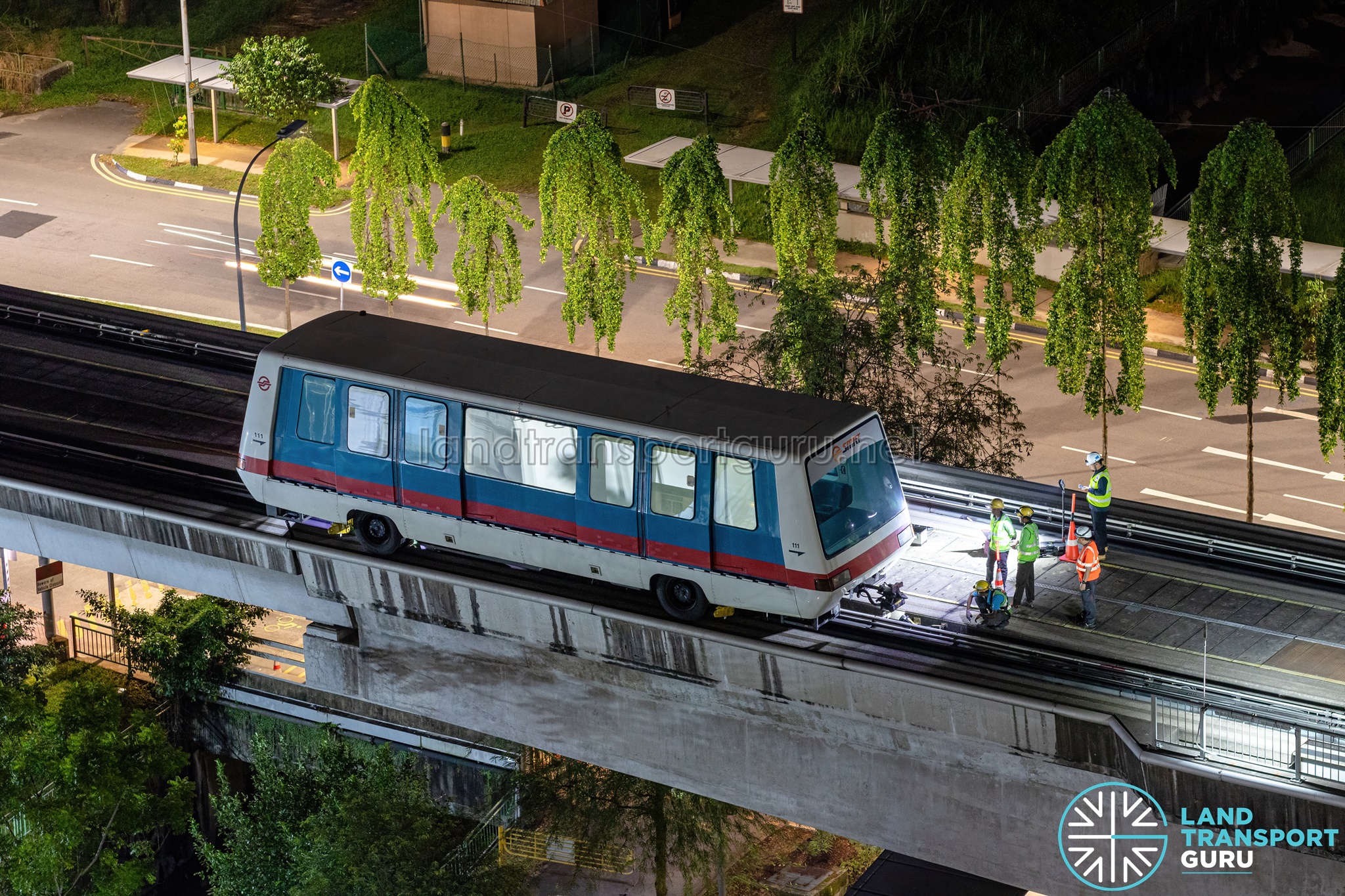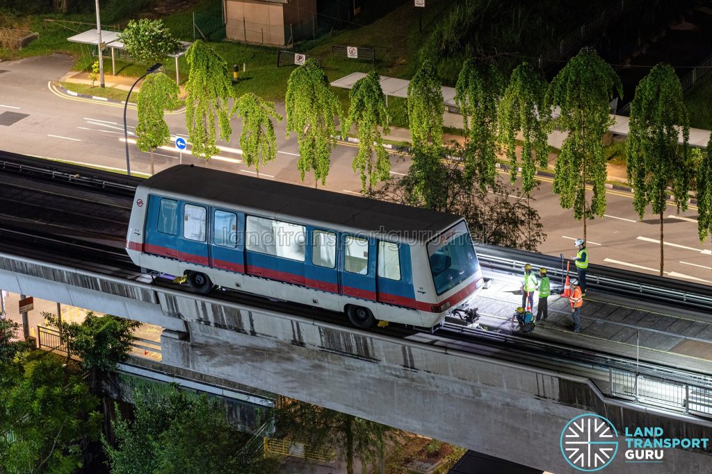 The BPLRT C801 train (Car 111) is prepared for lifting off the guiderail, and external lifting points are attached