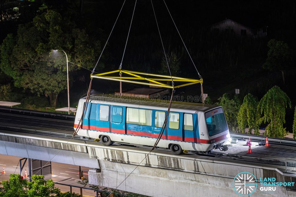 A frame lifting beam is positioned over the C801 Light Rail Vehicle