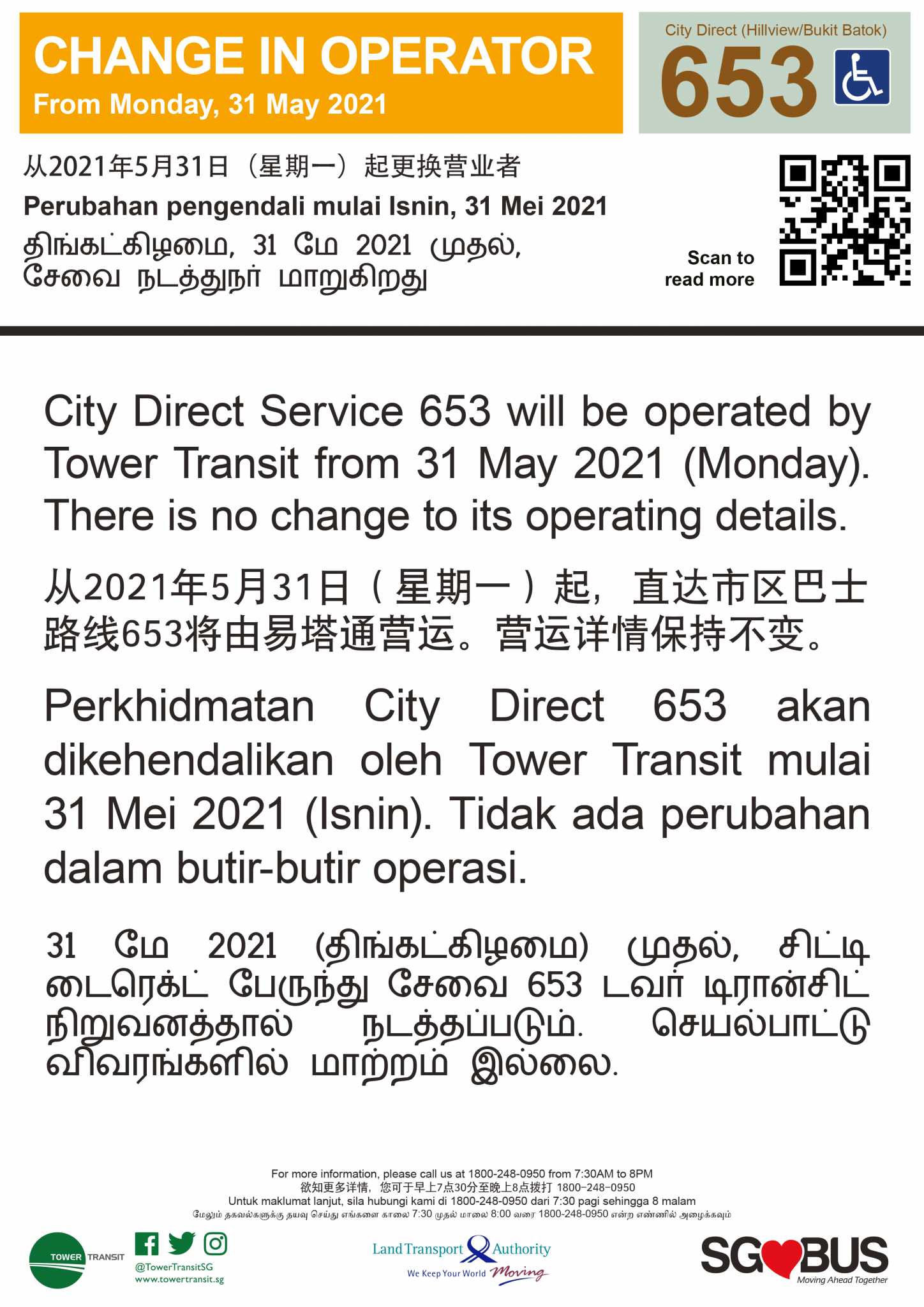 Tower Transit took over City Direct 653 from SMRT Buses, starting on Monday, 31 May 2021.
