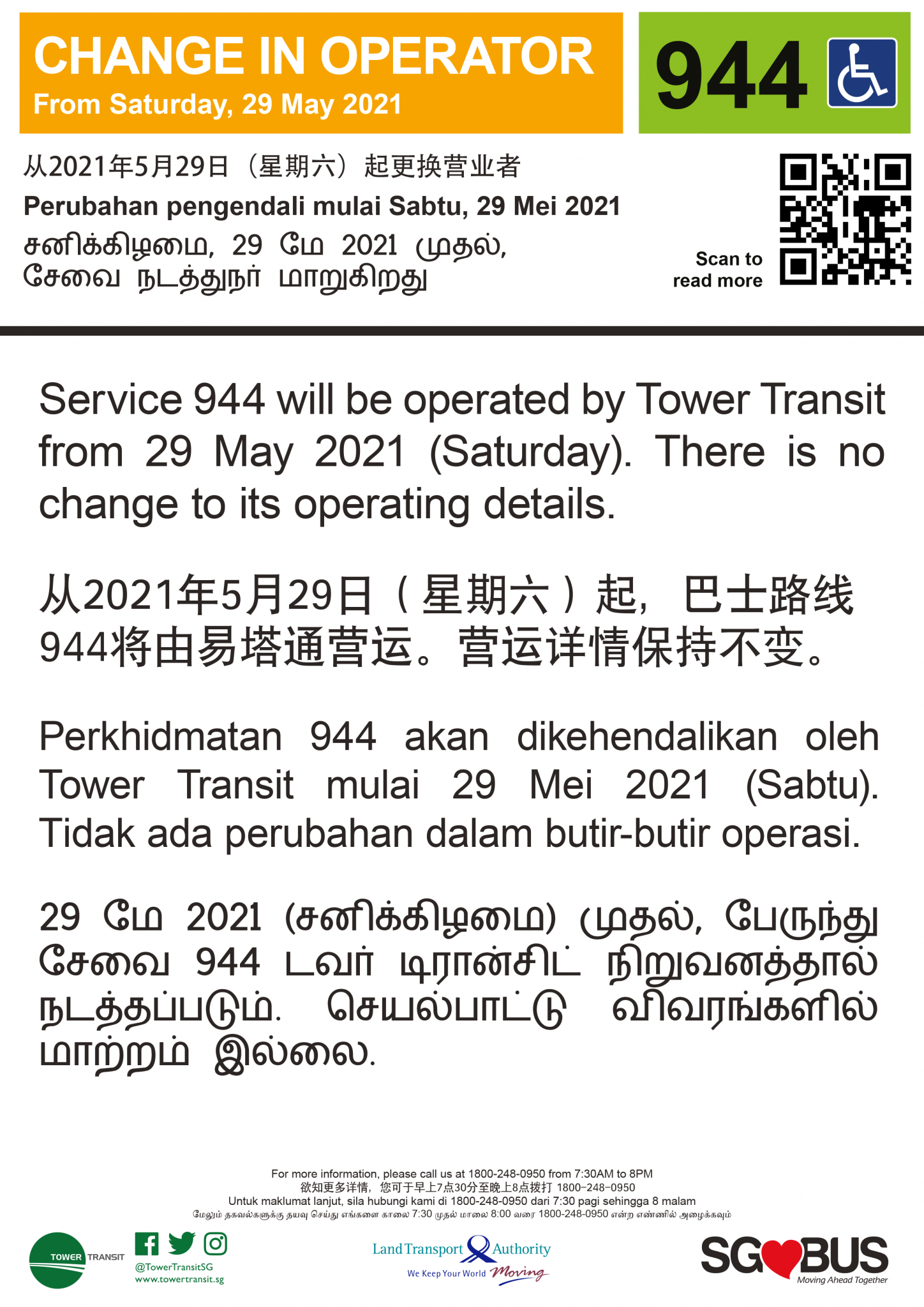 Tower Transit took over Service 944 from SMRT Buses, starting on Saturday, 29 May 2021.