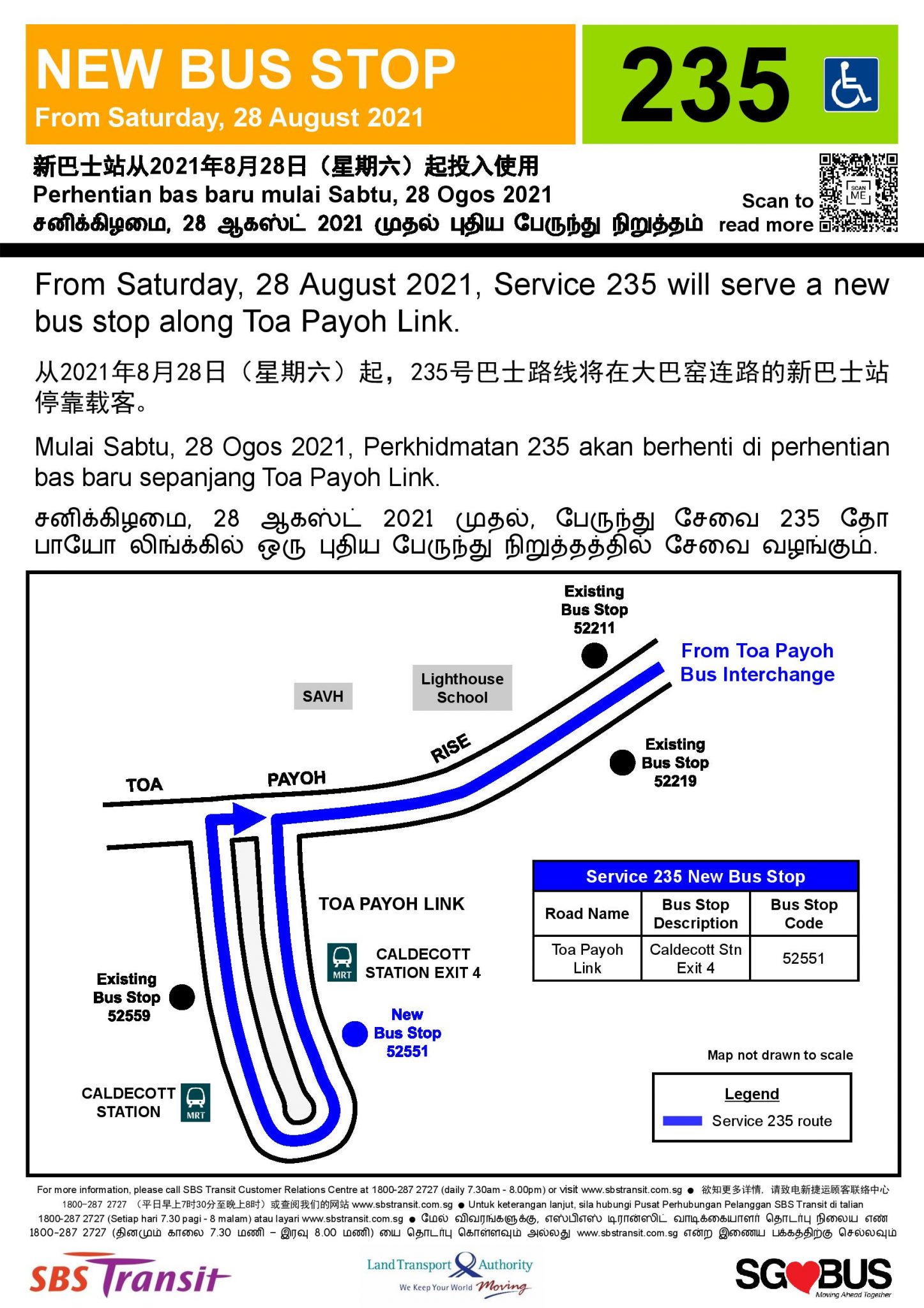 Feeder Service 235 serves residents and schools around Toa Payoh Lorongs 1, 3, 5 and 6 with connections to Toa Payoh Town Centre, while also connecting with Caldecott and Braddell MRT stations.