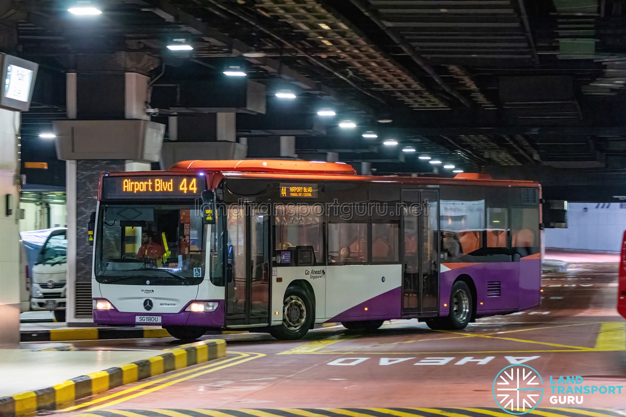 At Changi Airport, Service 44 serves all Passenger Terminal Buildings (PTBs) — Terminals 3, 1, 2, and 4 — in sequence. Bus stops for Terminals 1–3 are integrated into basement-level driveways, which also function as cargo loading and unloading bays. Before entering these secured zones, security checks are conducted for unattended or suspicious articles.