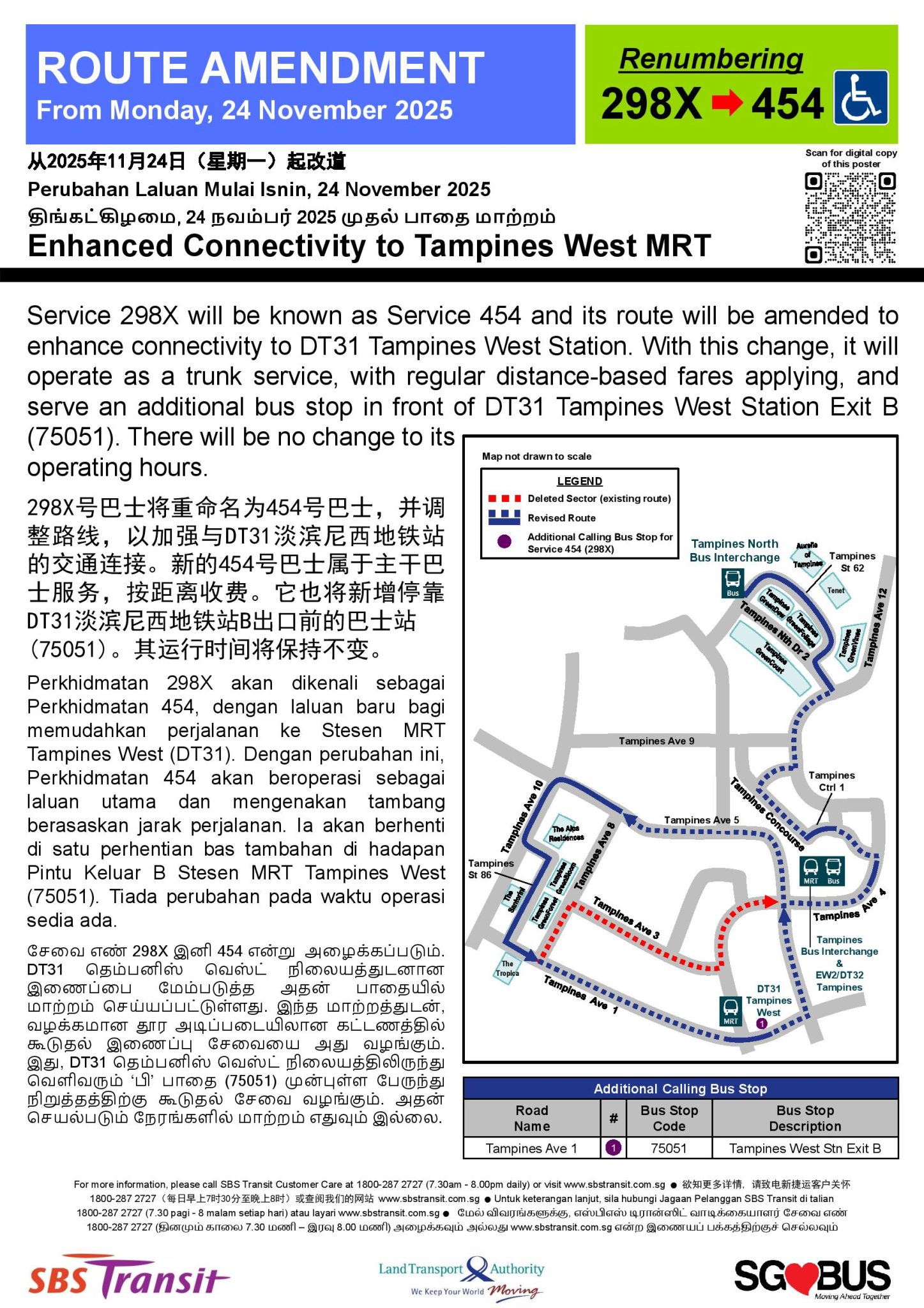 - 2025 (24 Nov): Renumbered from Service 298X as a limited-stop peak period bus service between Tampines North Int and Tampines St 86 (Loop) under the LTA’s Bus Connectivity Enhancement Programme (BCEP), serving an additional bus stop at Tampines West Stn Exit B along Tampines Ave 1. Charges regular distance fares.