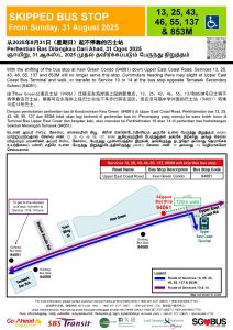 - 2025 (31 Aug): Skips the bus stop outside Kew Green Condo along Upp East Coast Rd towards Upp East Coast Ter