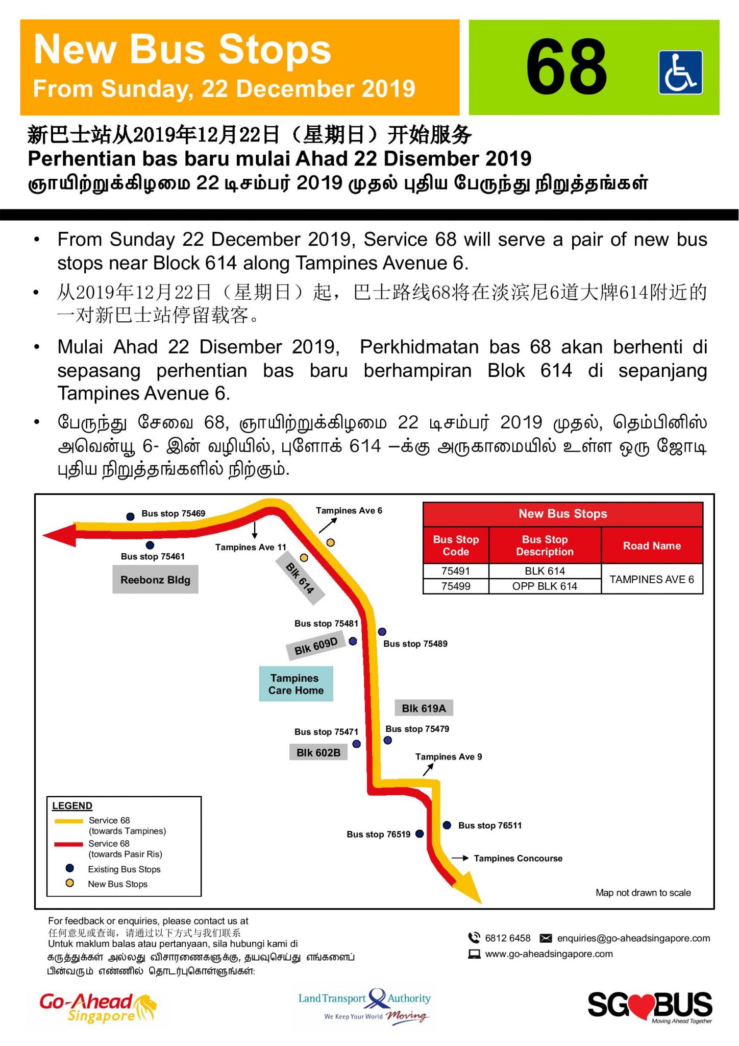 - Service 68A: Tampines Avenue 11 (Opp Reebonz Bldg) → Tampines Int