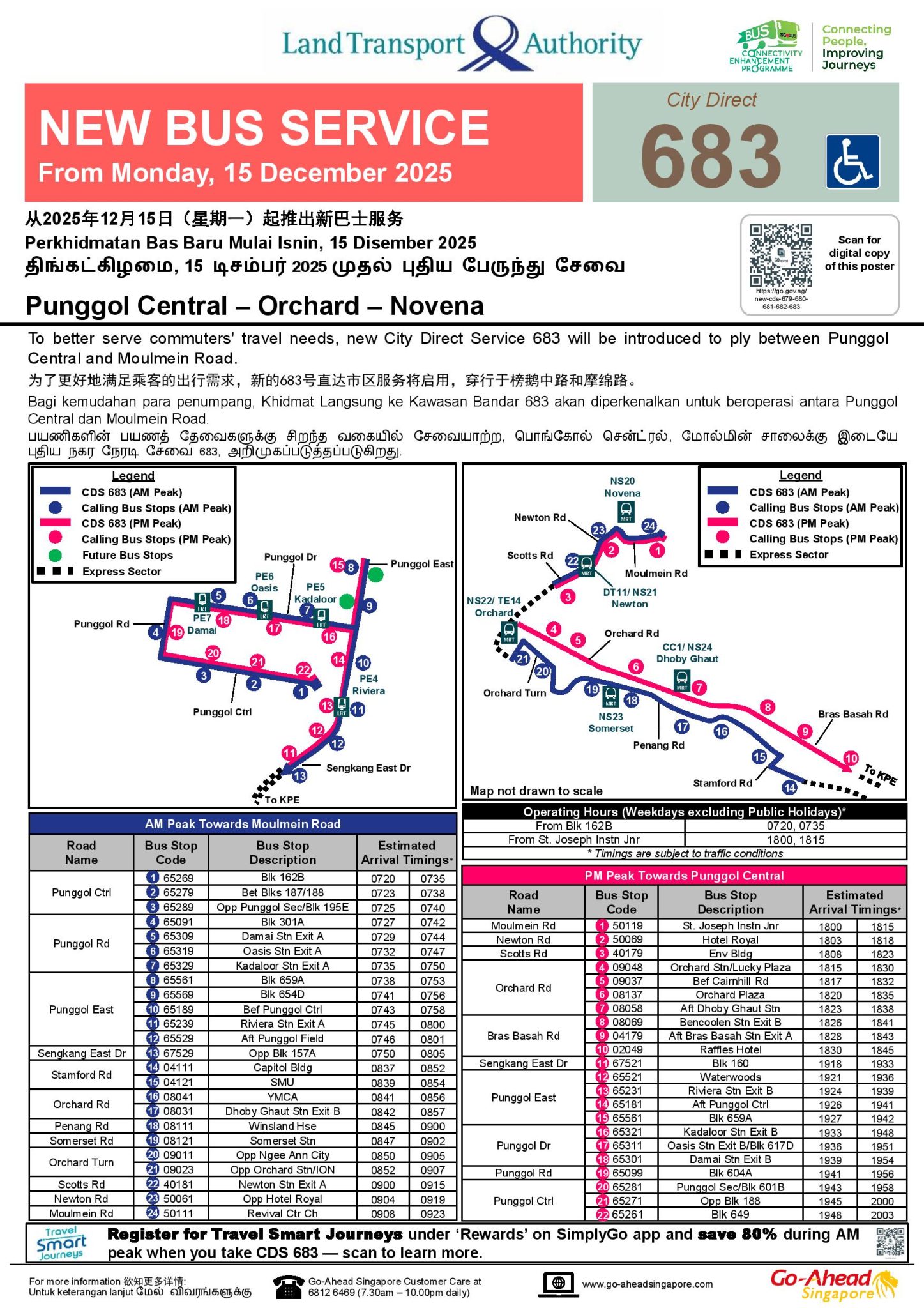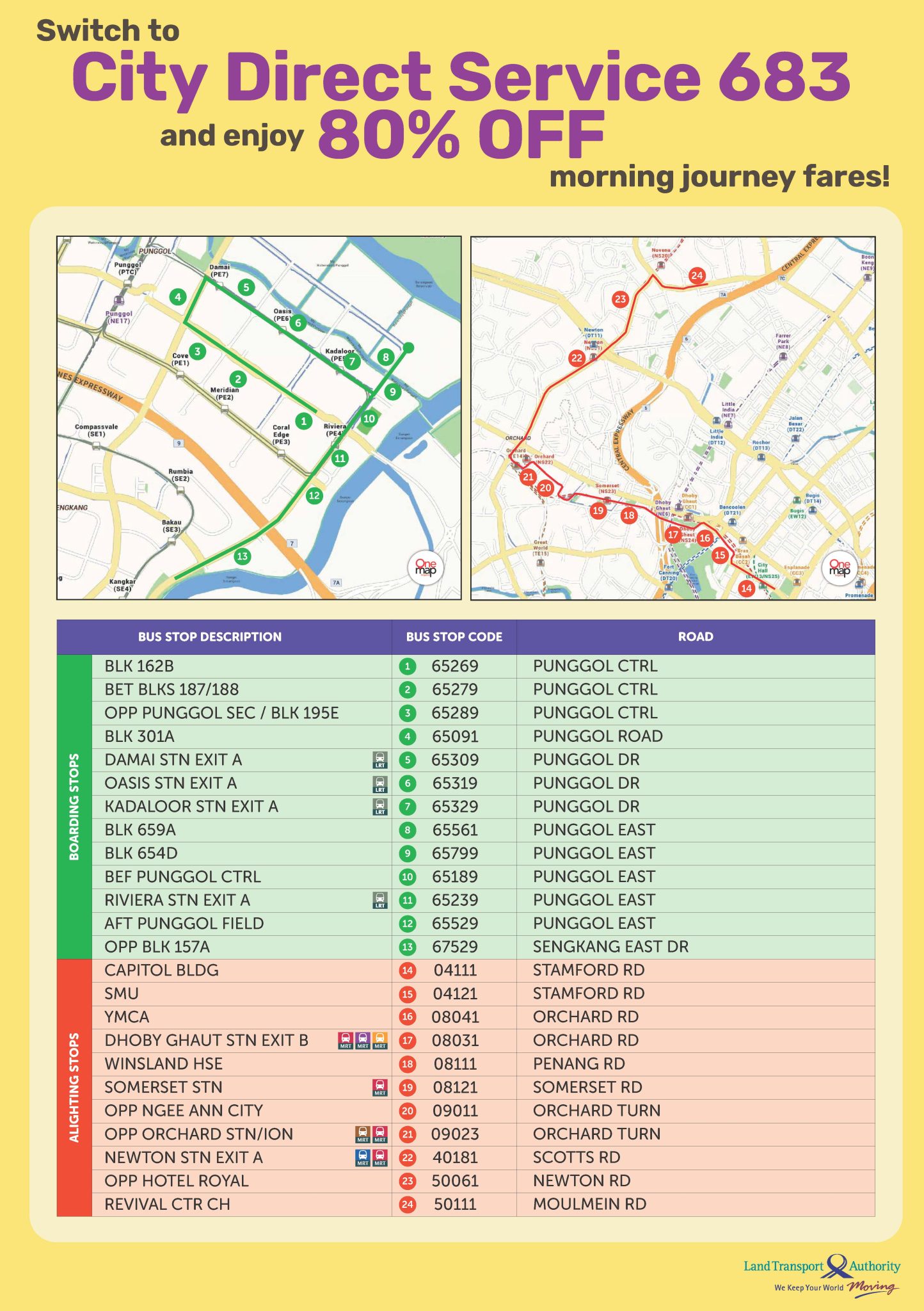 Service 683 offers residents of Punggol East improved connectivity to the Orchard area, providing a direct travel alternative to commuters who typically rely on the rail network and feeder buses. As a City Direct service, it only operates on weekdays.