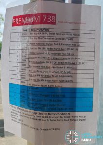 Premium Bus Service 738 is operated by a private transport operator Ng Ing Tsair Bus Service, running from Bedok Reservoir to Punggol Coast, via Bedok North and Bedok MRT.