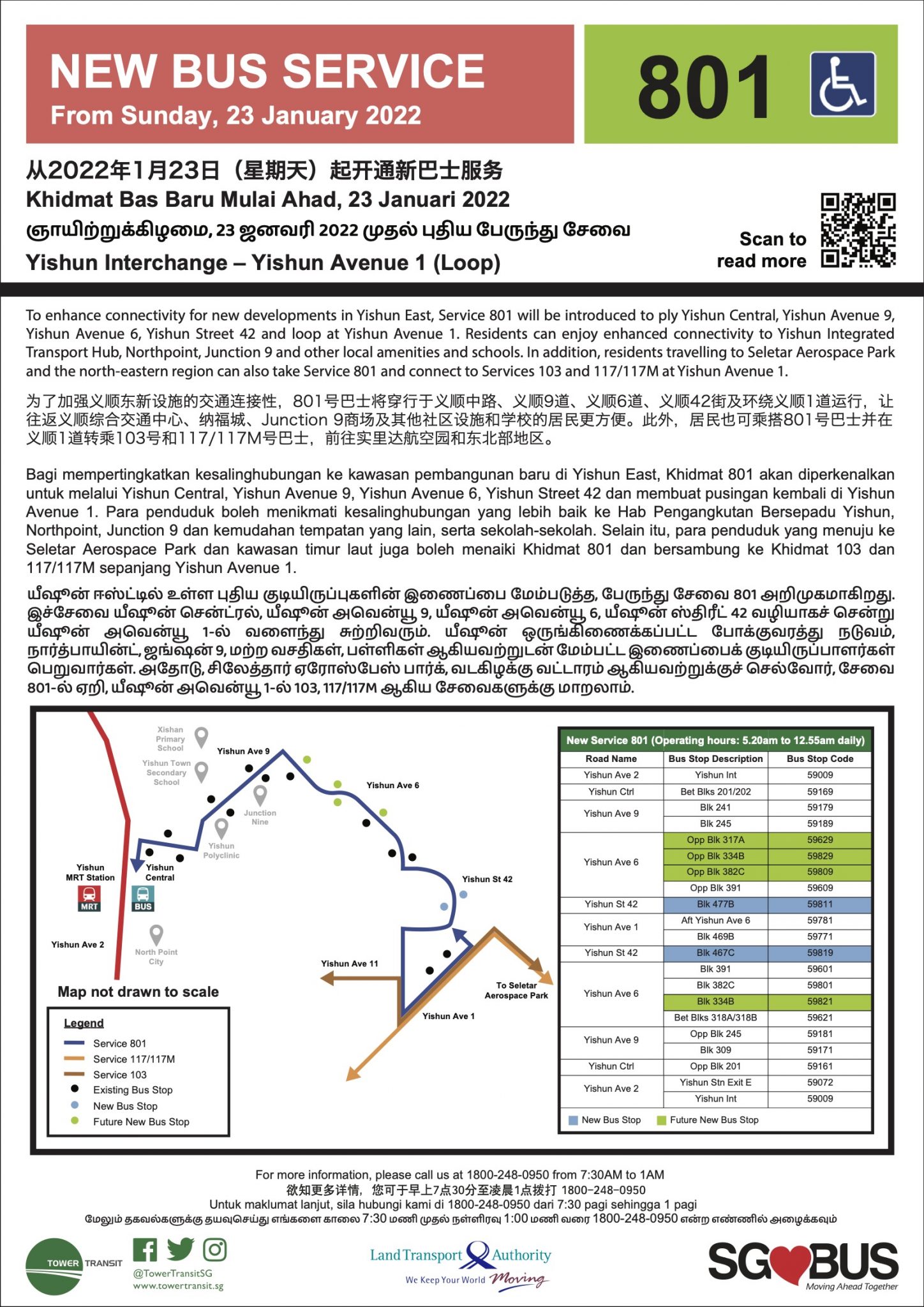 Feeder Service 801 is a feeder service from Yishun to Yishun Avenue 1, mainly serving residents living in the new housing estates along Yishun Avenue 6 & Yishun Street 42 with direct links to Yishun MRT Station / Bus Interchange as well as other schools & amenities along the route.