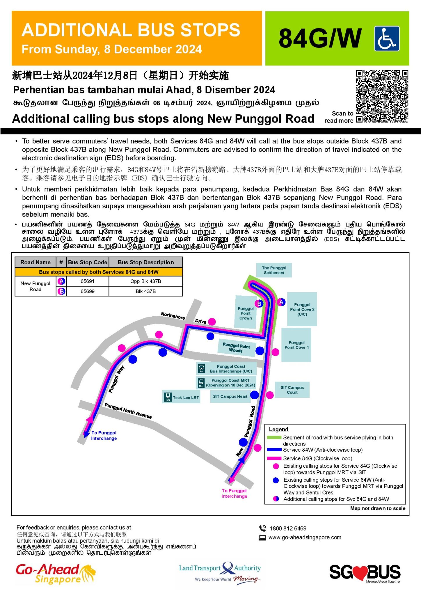 Service 84W connects residential areas in Northshore and Punggol North with key amenities in Punggol Town Centre, Punggol Point, and the new Punggol Digital District, which includes the Singapore Institute of Technology (SIT) Punggol Campus.