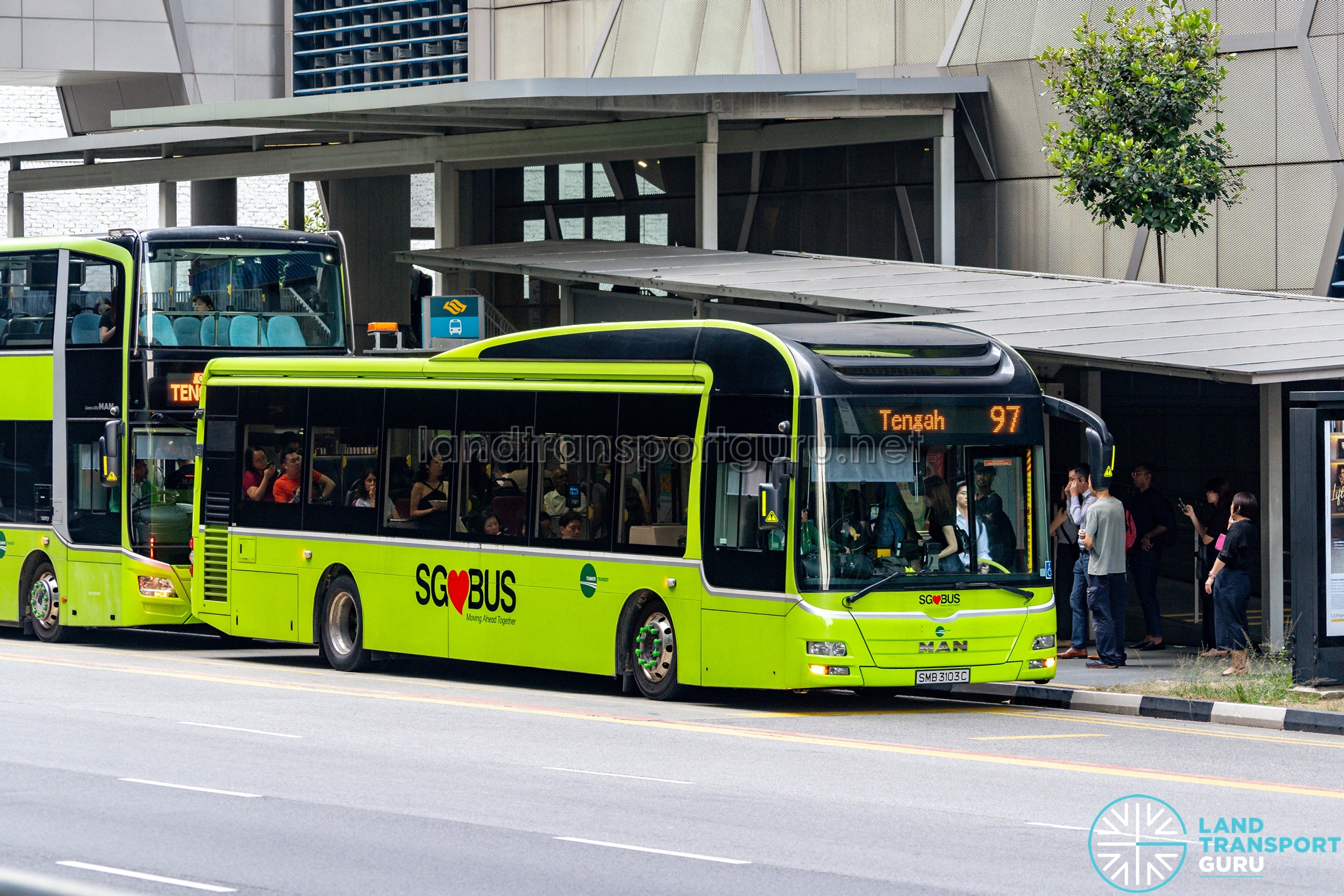 Tower Transit Bus Service 97 is a trunk service plying between Tengah and Marina Centre, passing through Bukit Batok Rd, Jurong Town Hall Rd, AYE, Alexandra, HarbourFront, Keppel Rd, Robinson Rd, Bayfront and Suntec City. Its express variant is Service 97e.
