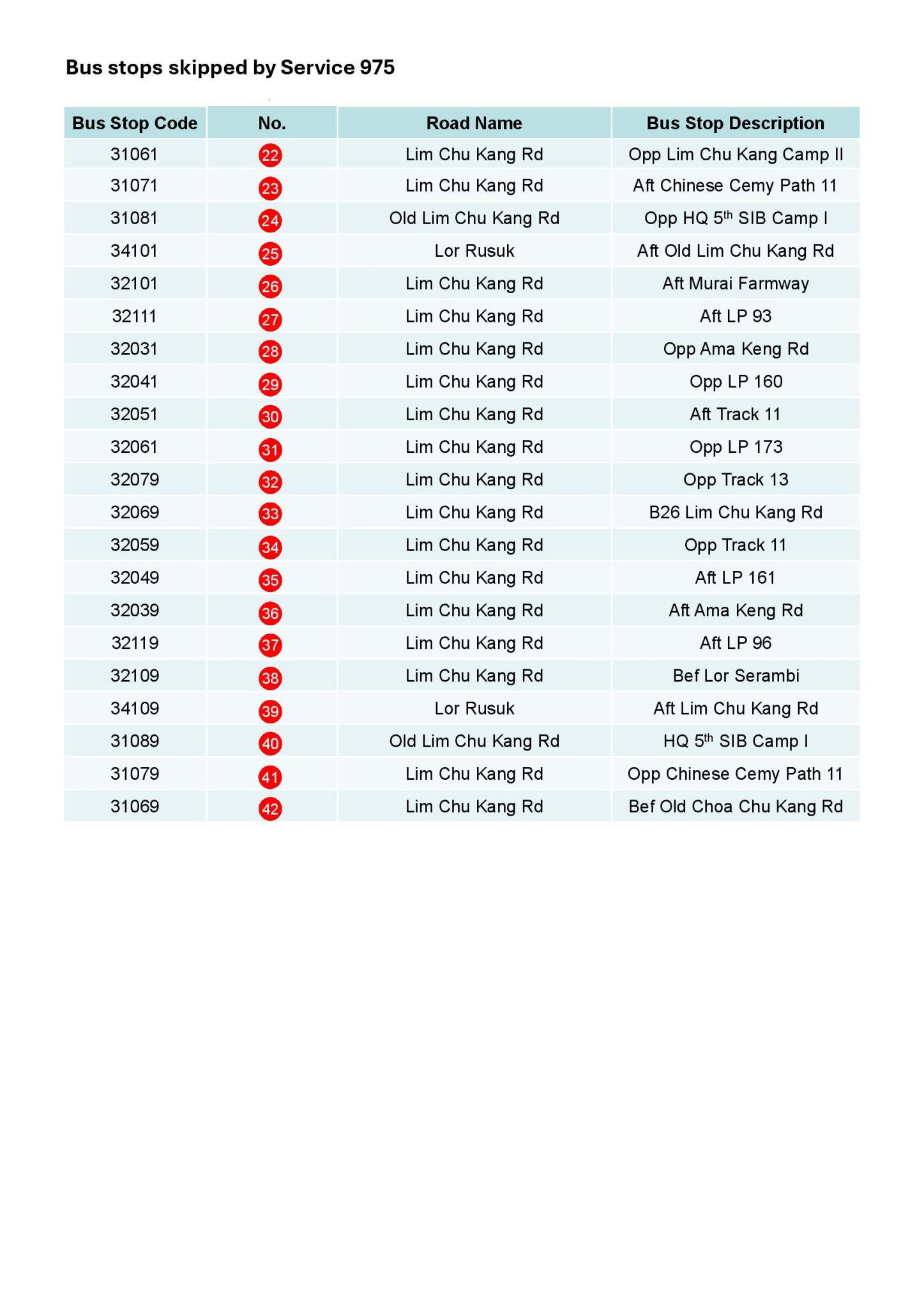 - 2025 (08 Jun): Amended to ply an extended stretch of Old Choa Chu Kang Rd and realigned Lim Chu Kang Rd, skipping part of Lim Chu Kang Rd, Old Lim Chu Kang Rd and Lorong Rusuk due to road closure to facilitate the expansion of Tengah Air Base