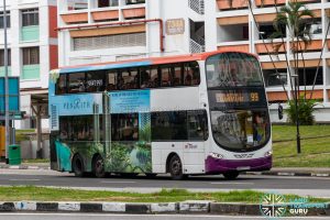 Service 99 is a lengthy residential trunk route, serving between the housing estates of Clementi, Jurong East, Jurong West and Pioneer North. Its primary role is shuttling commuters between different parts of the large Jurong West residential district rather than connecting commuters to nearby MRT stations. A majority double-deck bus fleet caters to all-day demand from residents.