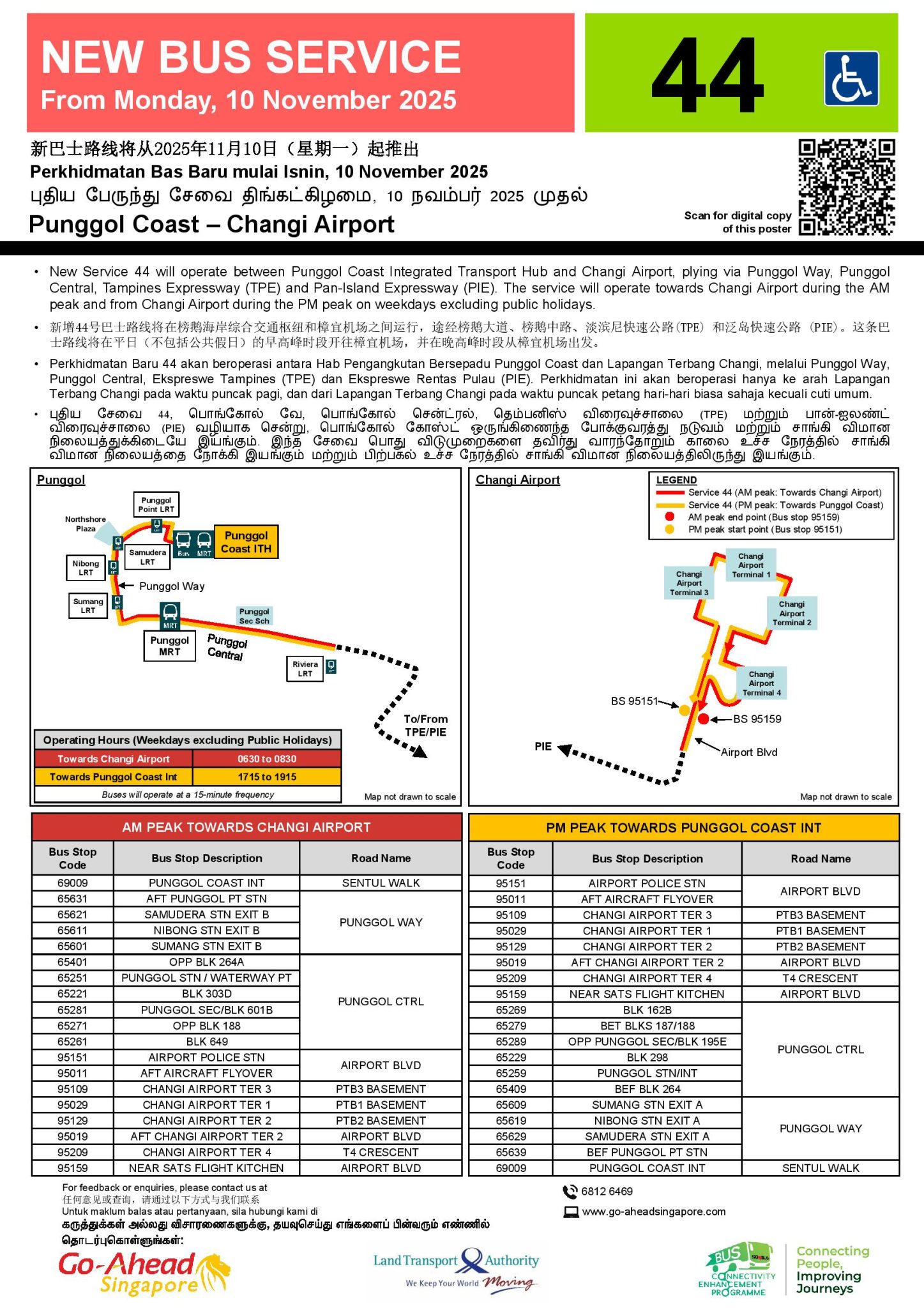 After receiving feedback from Punggol residents about the long travel time between Punggol and Changi Airport by Bus Service 34, Senior Minister of State (SMS) for Transport and Member of Parliament (MP) for Punggol GRC, Sun Xueling, announced that the Land Transport Authority (LTA) was studying the launch of a new direct route between the new town and the airport. This new service was eventually introuced as Bus Service 44, operating a total of 18 trips (9 trips per direction) during peak hours on weekdays from Monday, 10 November 2025.