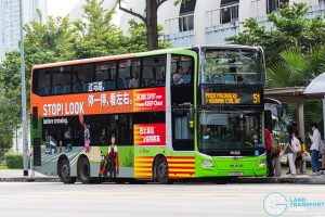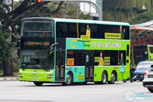 In late March 2023, SBS Transit launched the “Be Safe, Be Seen” Road Safety Campaign, in which 15 buses were wholly wrapped for the campaign, except a strip on the front one-third of the bus for the operator logo.