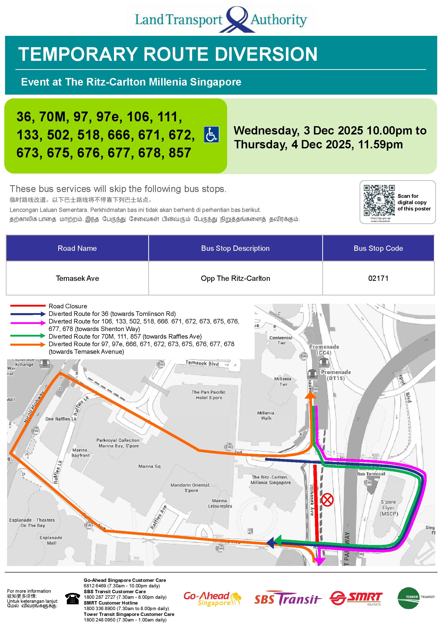 December 3 @ 10:00 PM - December 5 @ 12:00 AM UTC+8 Bus Service Diversion for Event at The Ritz-Carlton Millenia Singapore (Dec 2025)
