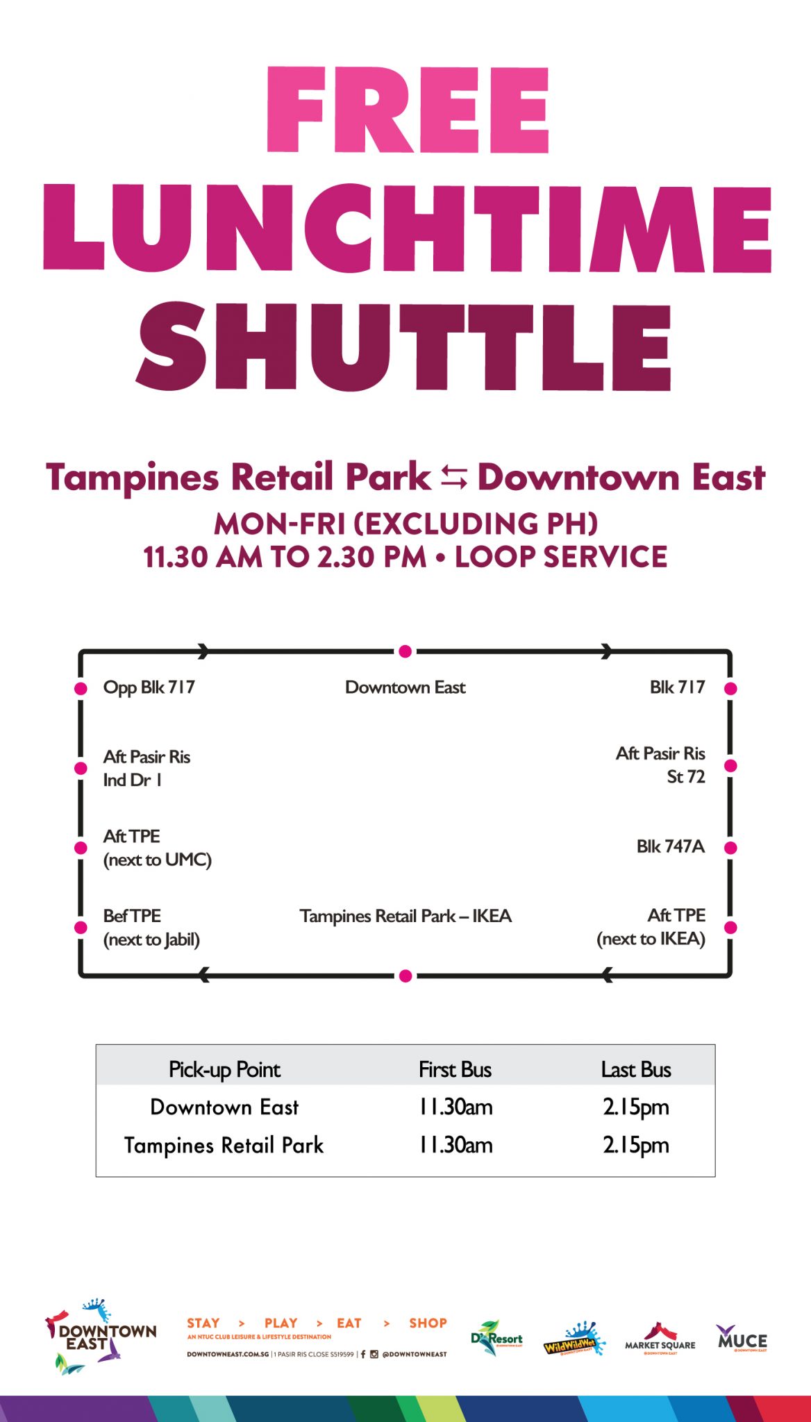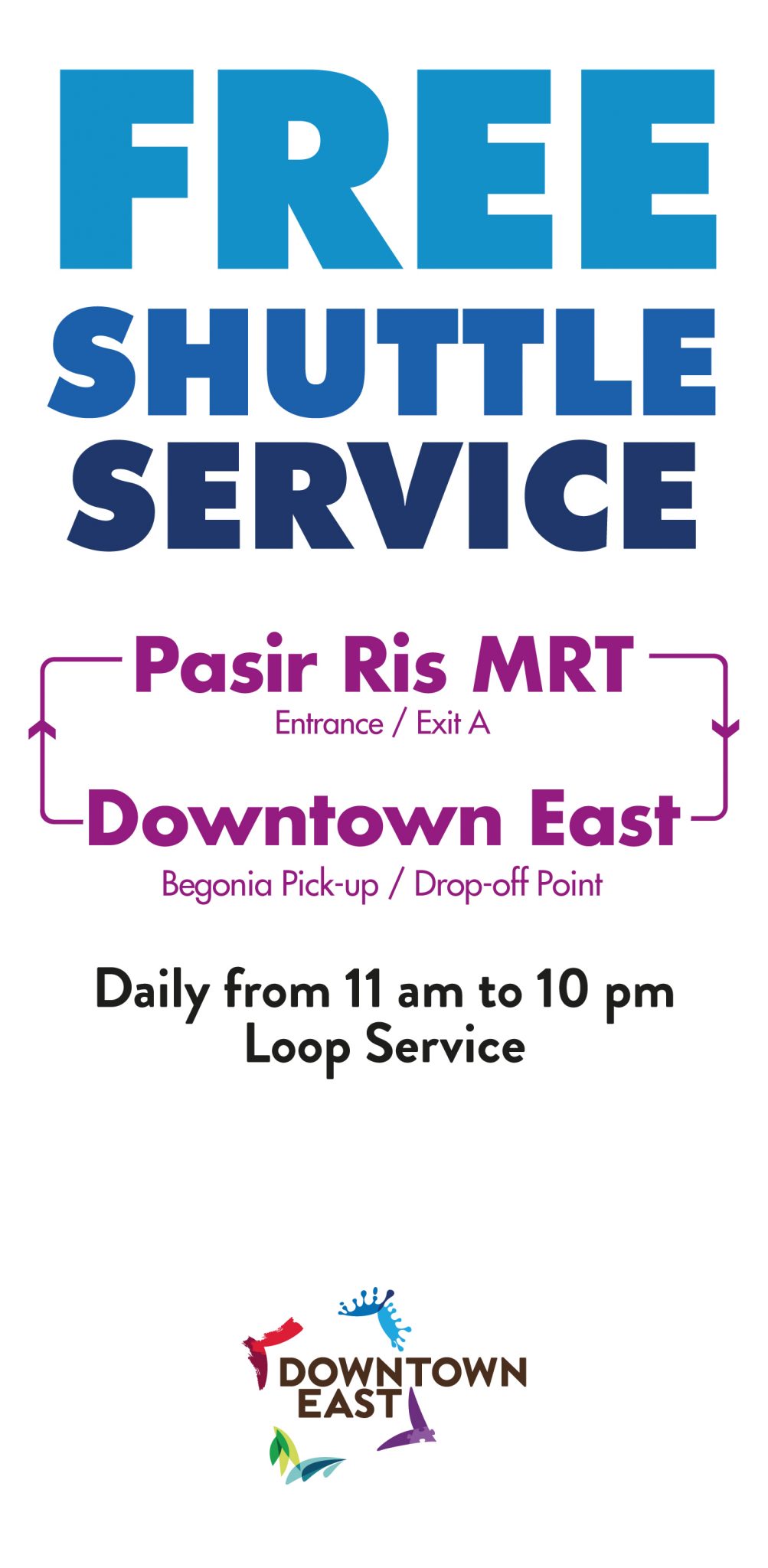 Downtown East, located at Pasir Ris, provides free shuttle services daily from Pasir Ris MRT Station, as well as a lunchtime shuttle service on Mondays, Tuesdays & Thursdays (except Public Holidays).