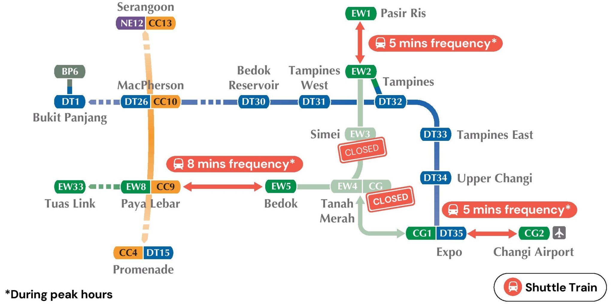 The East-West Line (EWL) was closed between Bedok–Tampines and Tanah Merah–Expo from Saturday, 29 November 2025, to Monday, 8 December 2025. This was to facilitate modification works needed to integrate the EWL with the new East Coast Integrated Depot (ECID), and to operationalise the new train platform at Tanah Merah.