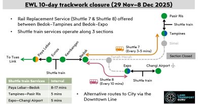 No Train Service will be available on the East-West Line (EWL) between Bedok – Tampines & Tanah Merah – Expo … Continue reading 10 Day Closure on East-West Line (Bedok – Tampines / Tanah Merah – Expo) for Integration Works