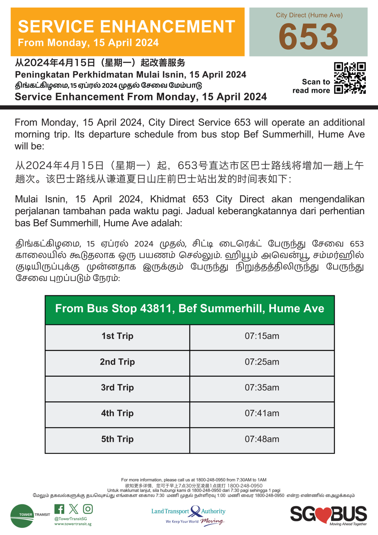 From Monday, 15 April 2024, an additional morning trip will be added to City Direct 653 from Hume Avenue (Bef Summerhill), with an adjustment to the departure timings.