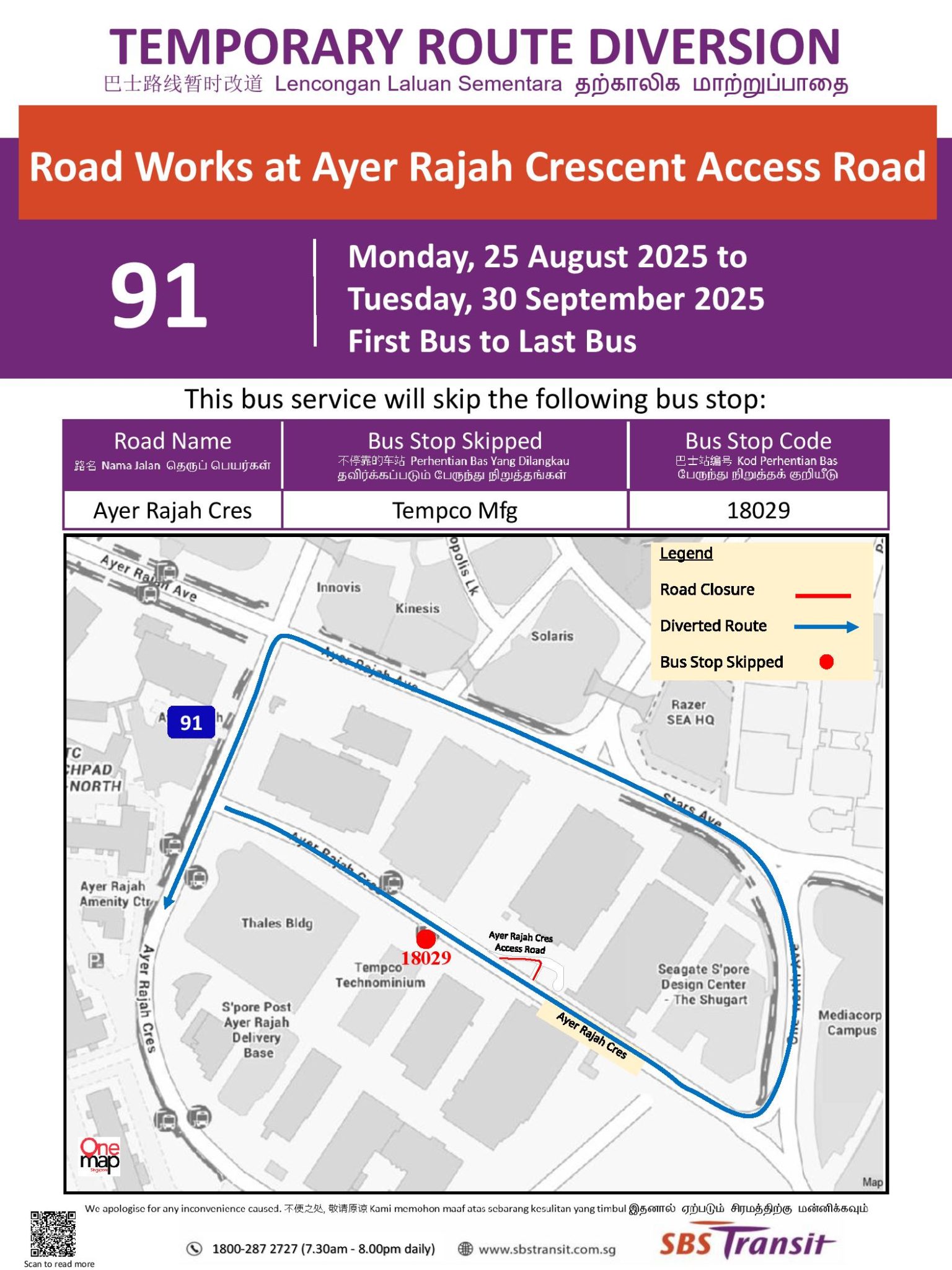 Service 91 will skip the bus stop outside Tempco Mfg along Ayer Rajah Cres due to road works at the turnback from 25 Aug to 30 Sep 2025.