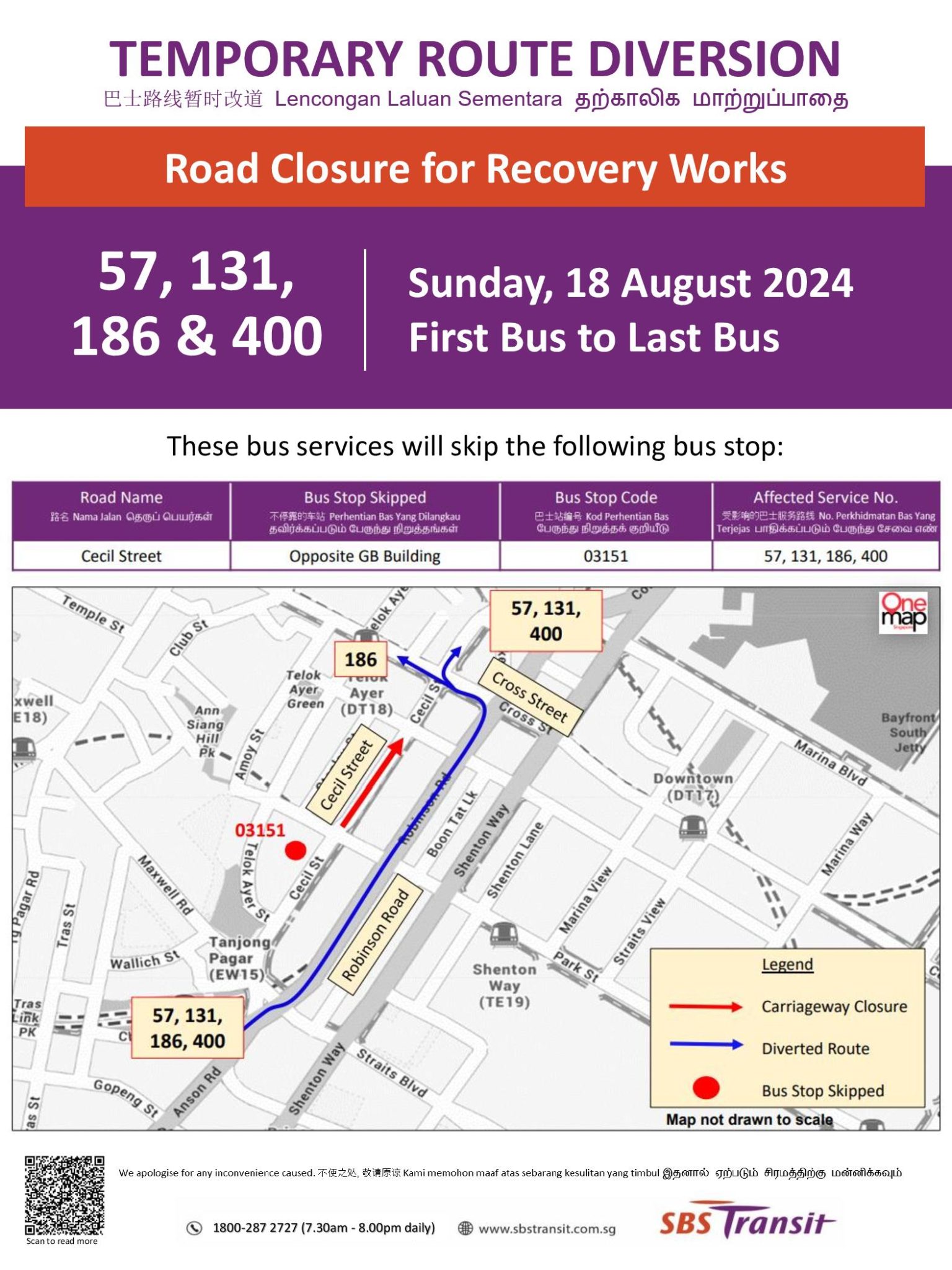Bus Services serving Cecil Street will be diverted on Sunday, 18 August 2024 due to the closure of a section of Cecil Street for building recovery works.