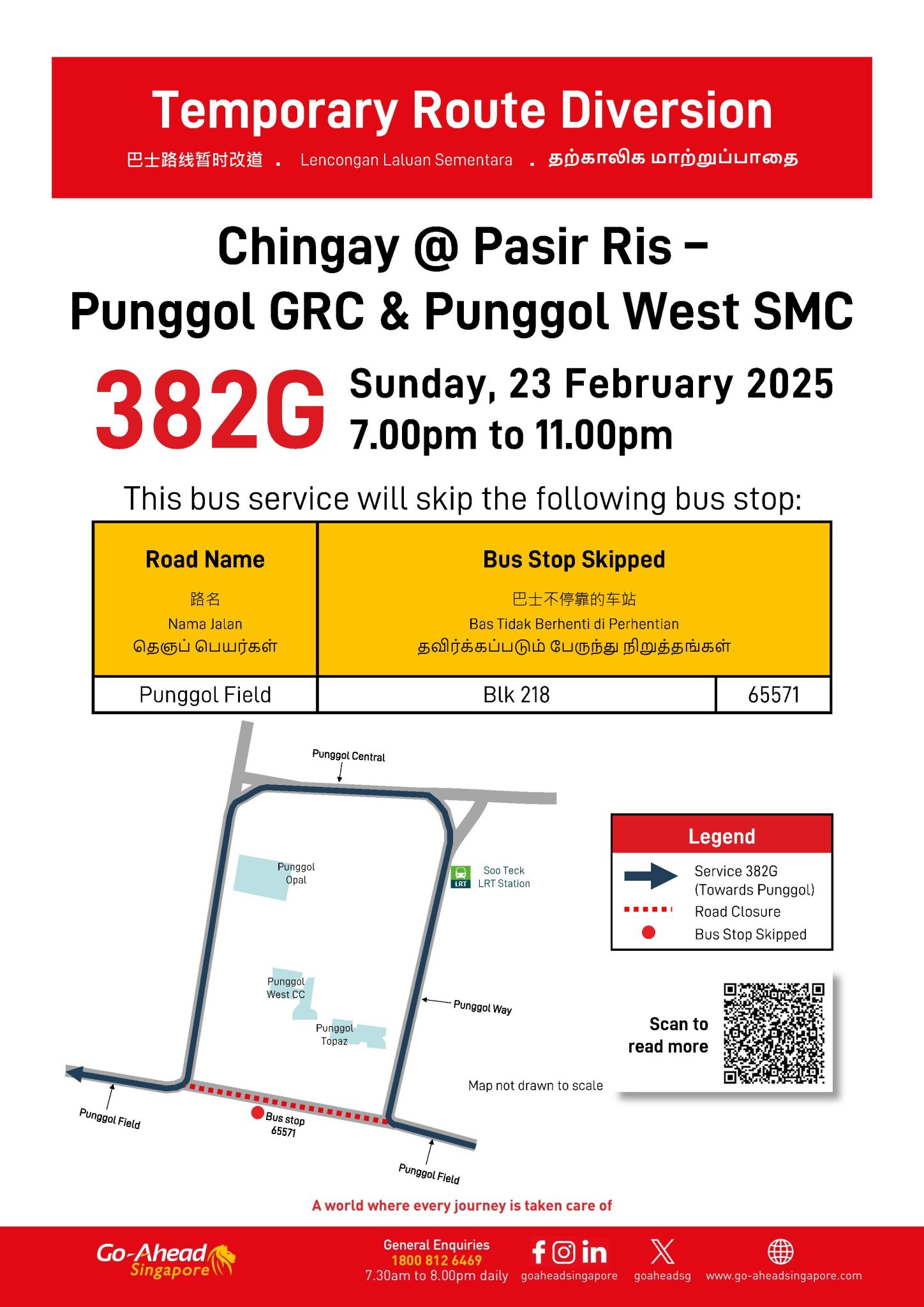 Service 382G will be affected due to road closure for Chingay @ Heartlands 2025 (Pasir Ris – Punggol GRC & Punggol West SMC) on Sunday 23 Feb 2025.