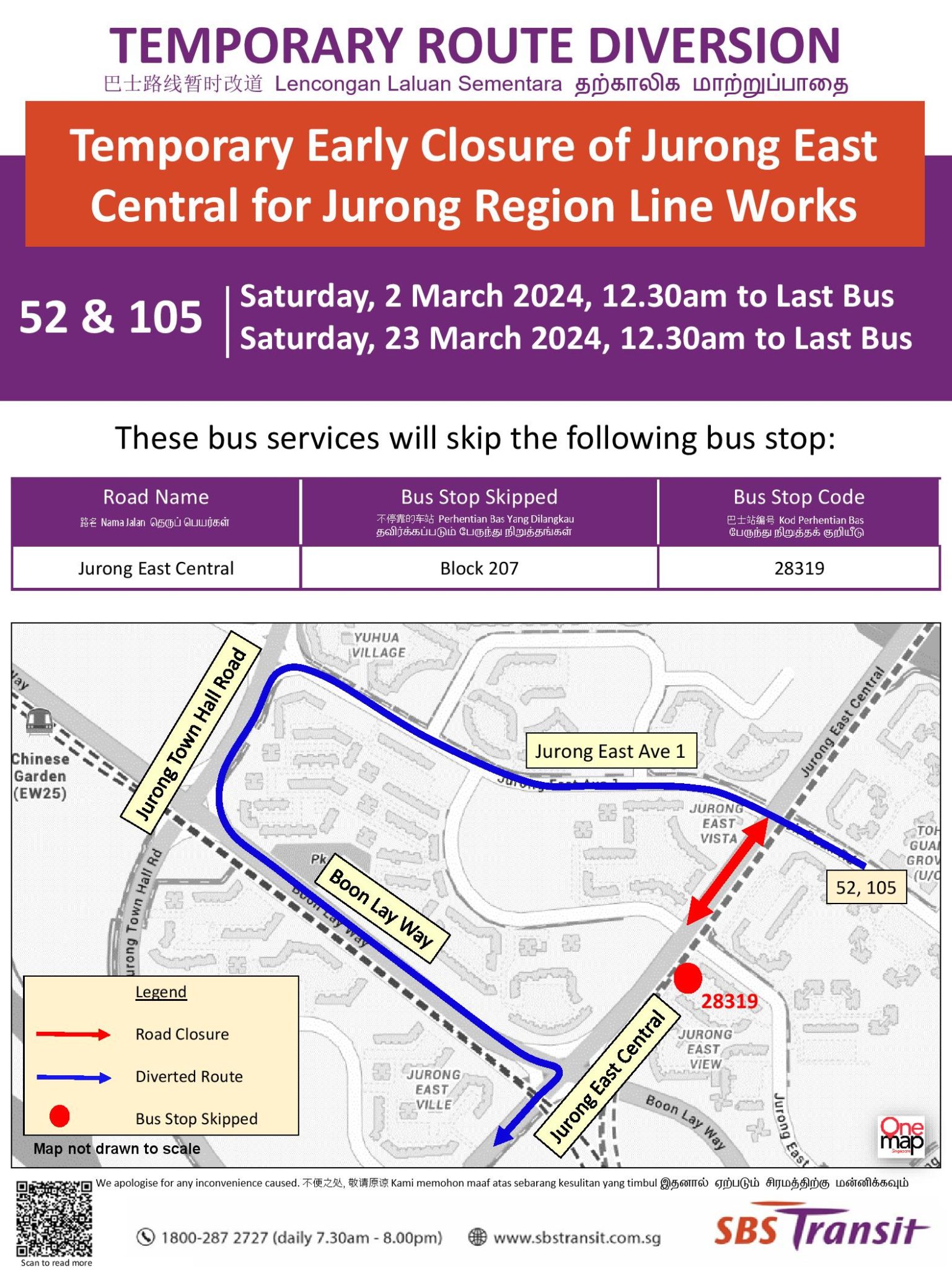 | Bus Stops Skipped for Temporary Early Closure of Jurong East Central for Jurong Region Line Works Saturday, 2 March 2024 12:30am – Last Bus |