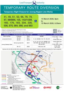 | Bus Stops Skipped for Temporary Night Closure for Jurong Region Line Works Saturday, 14 March 2026 9:00pm – Sunday, 15 March 2026 6:30am |