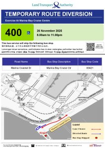 Bus Service 400 will be affected by an Exercise at Marina Bay Cruise Centre on 26 Nov 2025.