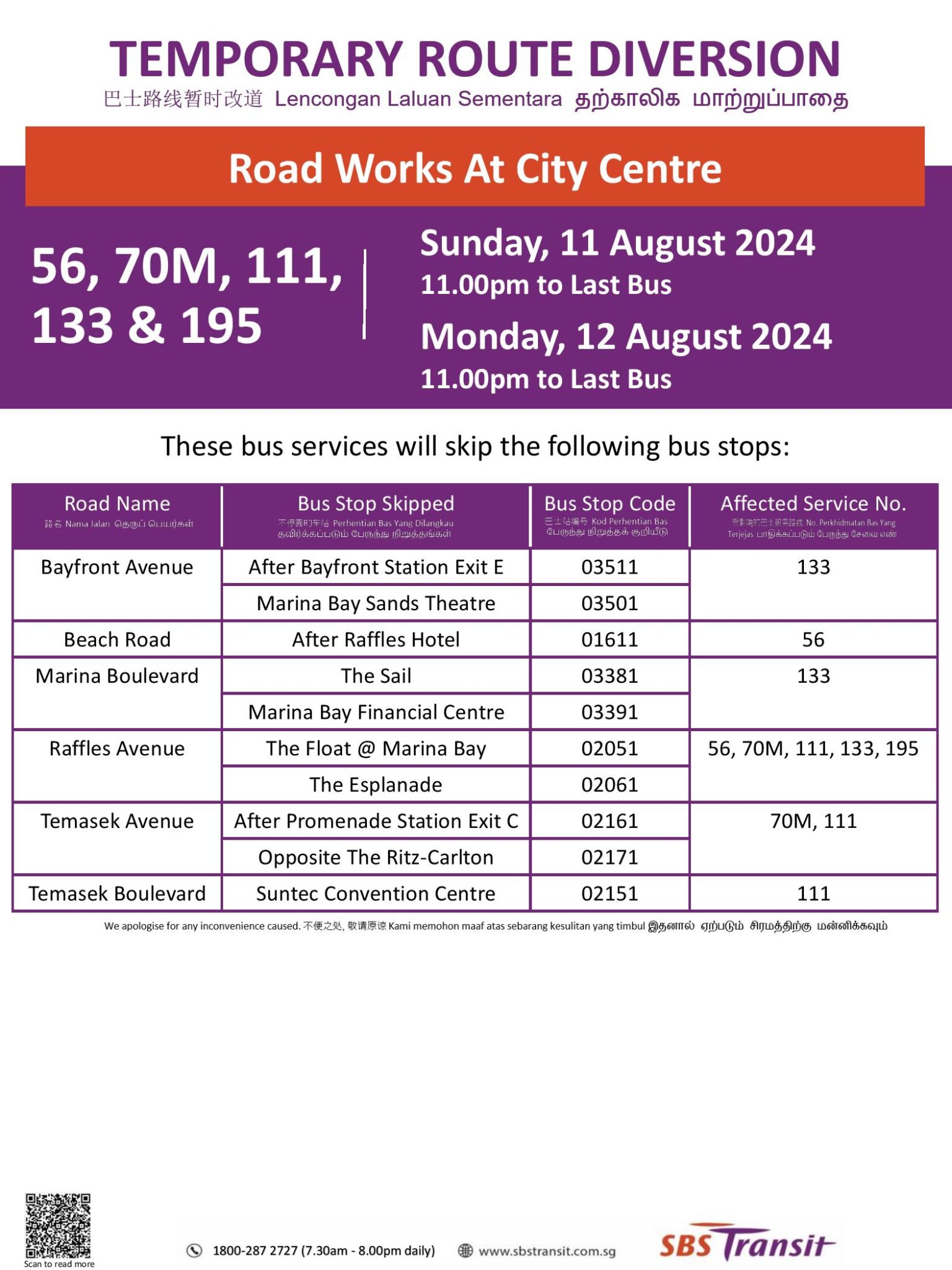 | Bus Stops Skipped for Road Works at City Centre Sunday, 11 August 2024; 11.00pm – Last Bus & Monday, 12 August 2024; 11.00pm – Last Bus |