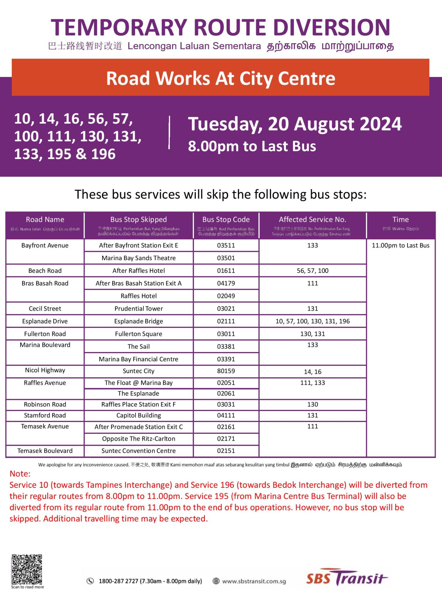 | Bus Stops Skipped for Road Works at City Centre Friday, 23 August 2024 11.00pm – Last Bus |