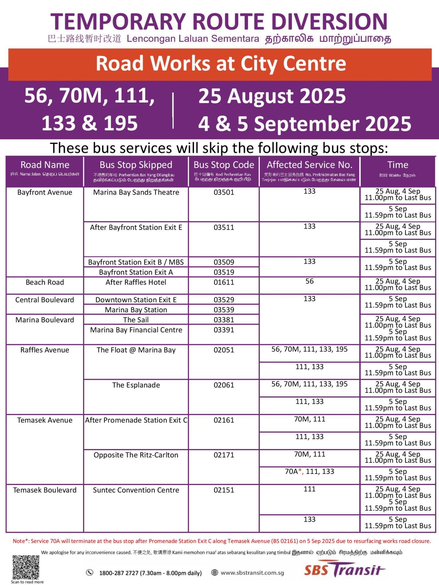 - Bus Stop 02051 – The Float @ Marina Bay along Raffles Ave is also closed due to F1 Singapore Grand Prix 2025 Preparation from 27 Aug to 6 Oct 2025.