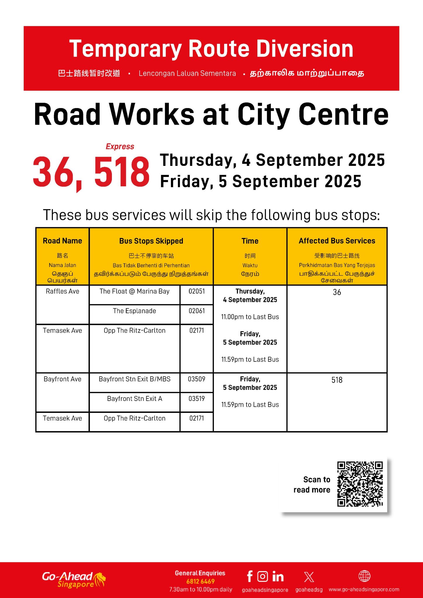 | Bus Stops Skipped for Road Works at City Centre Saturday, 6 September 2025 11.59pm – Last Bus |