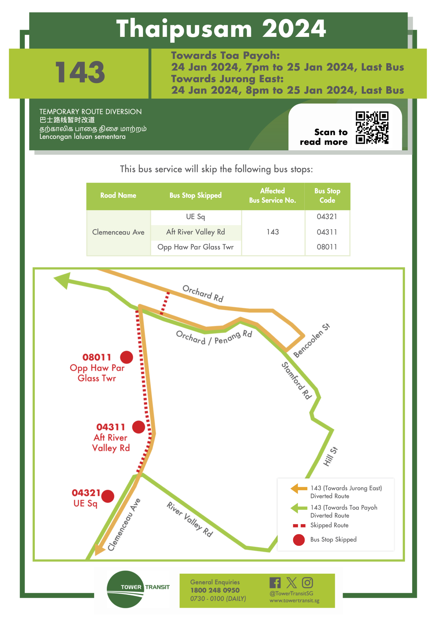 | Bus Stops Skipped for Thaipusam 2024 Wednesday, 24 January 2024, 7:00pm – Thursday, 25 January 2024, Last Bus |