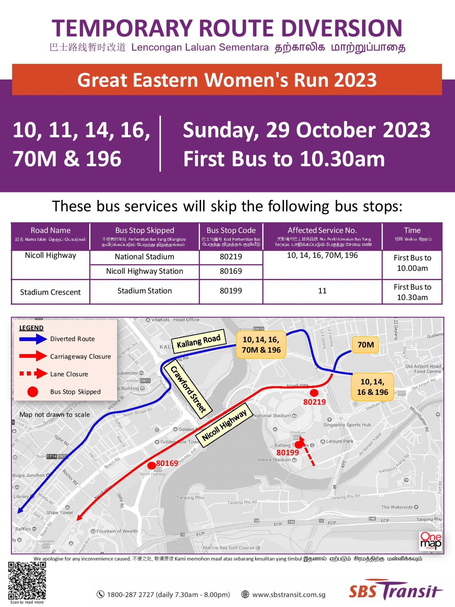 Bus Services along Nicoll Highway & Stadium Crescent will be diverted on Sunday, 29 October 2023 for the Great Eastern Women’s Run 2023.