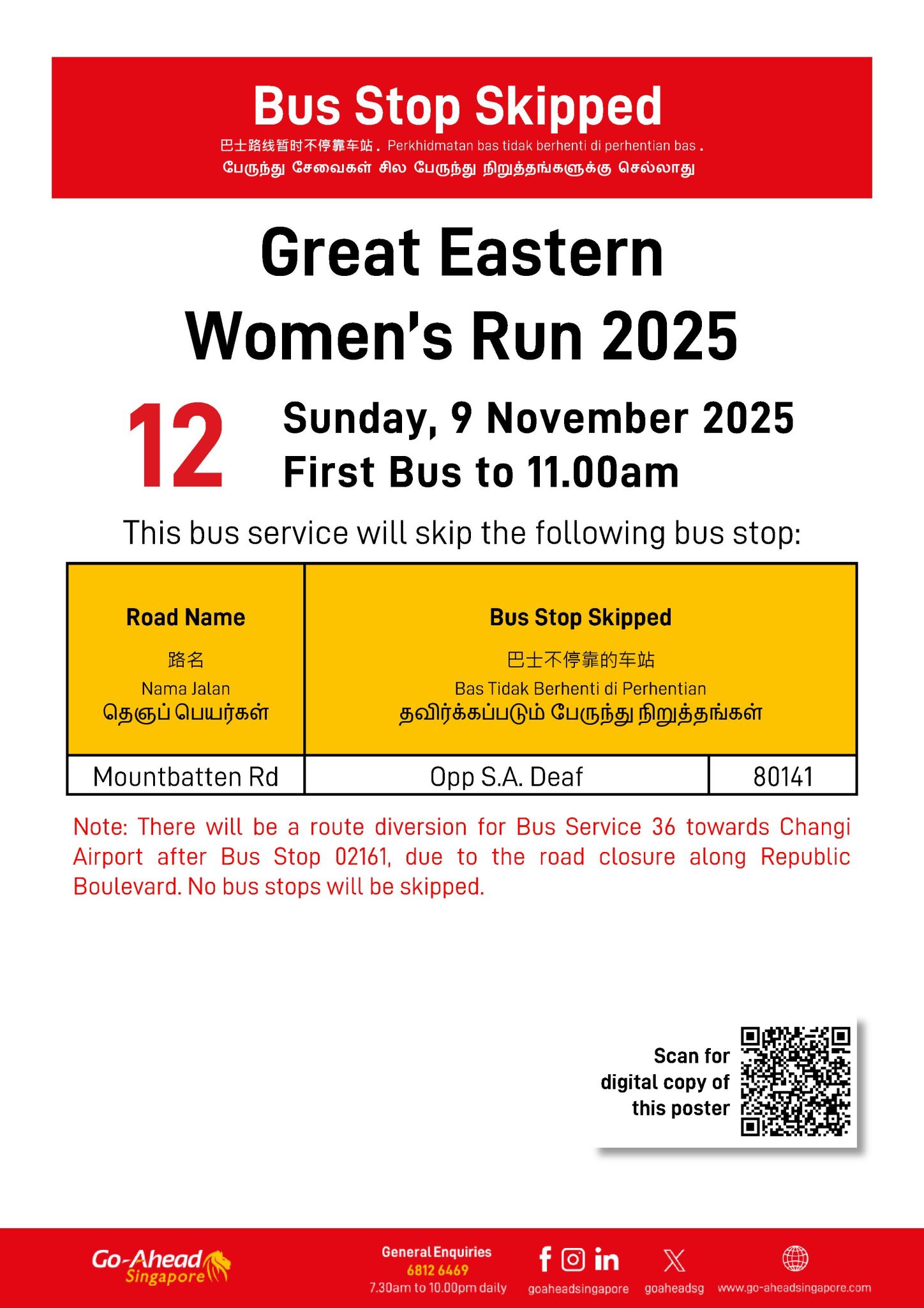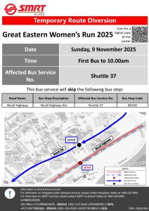 Bus Services will be diverted on Sunday, 9 November 2025 for the Great Eastern Women’s Run 2025.