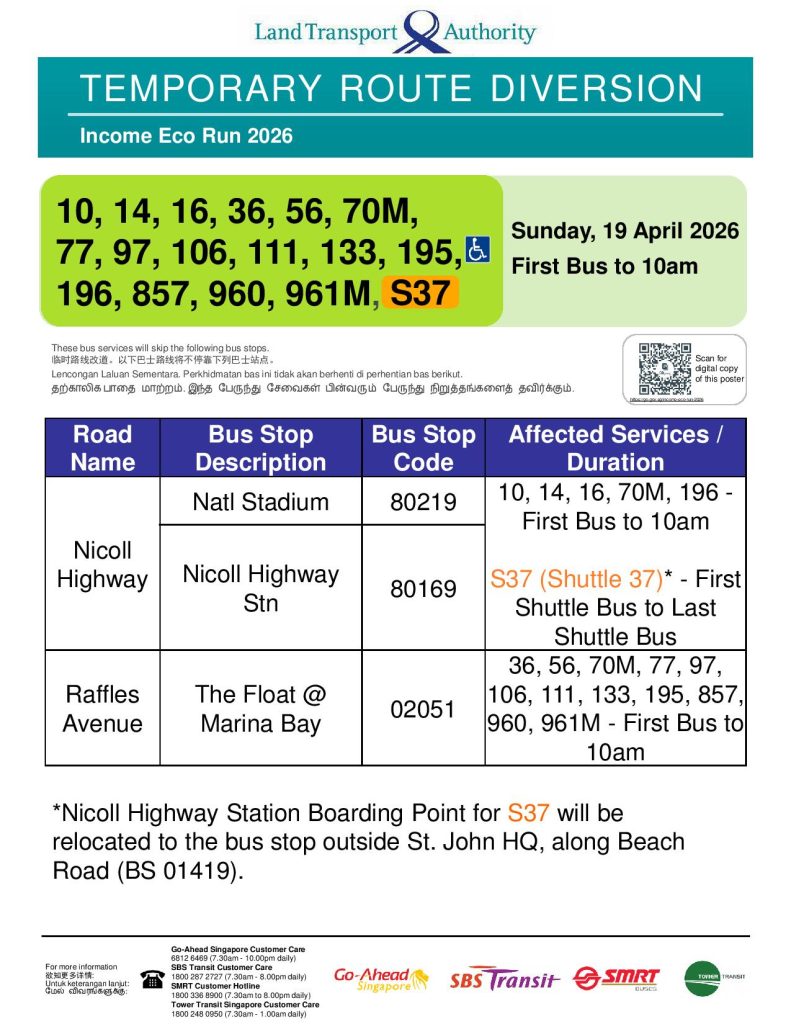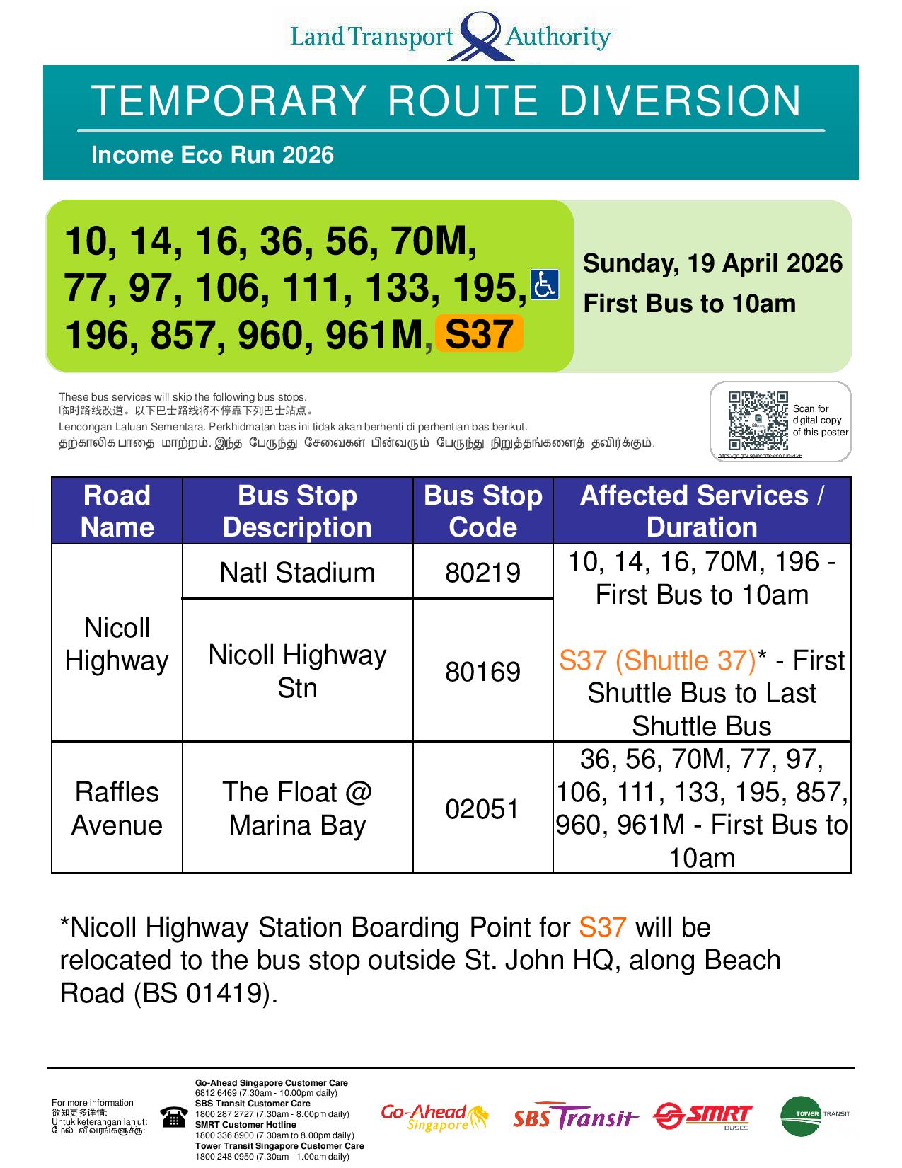• During the diversion on Sunday morning, the temporary Boarding / Alighting point for Shuttle 37 at Nicoll Highway station towards Promenade will be relocated to Bus Stop 01419 – St. John HQ, Beach Rd.