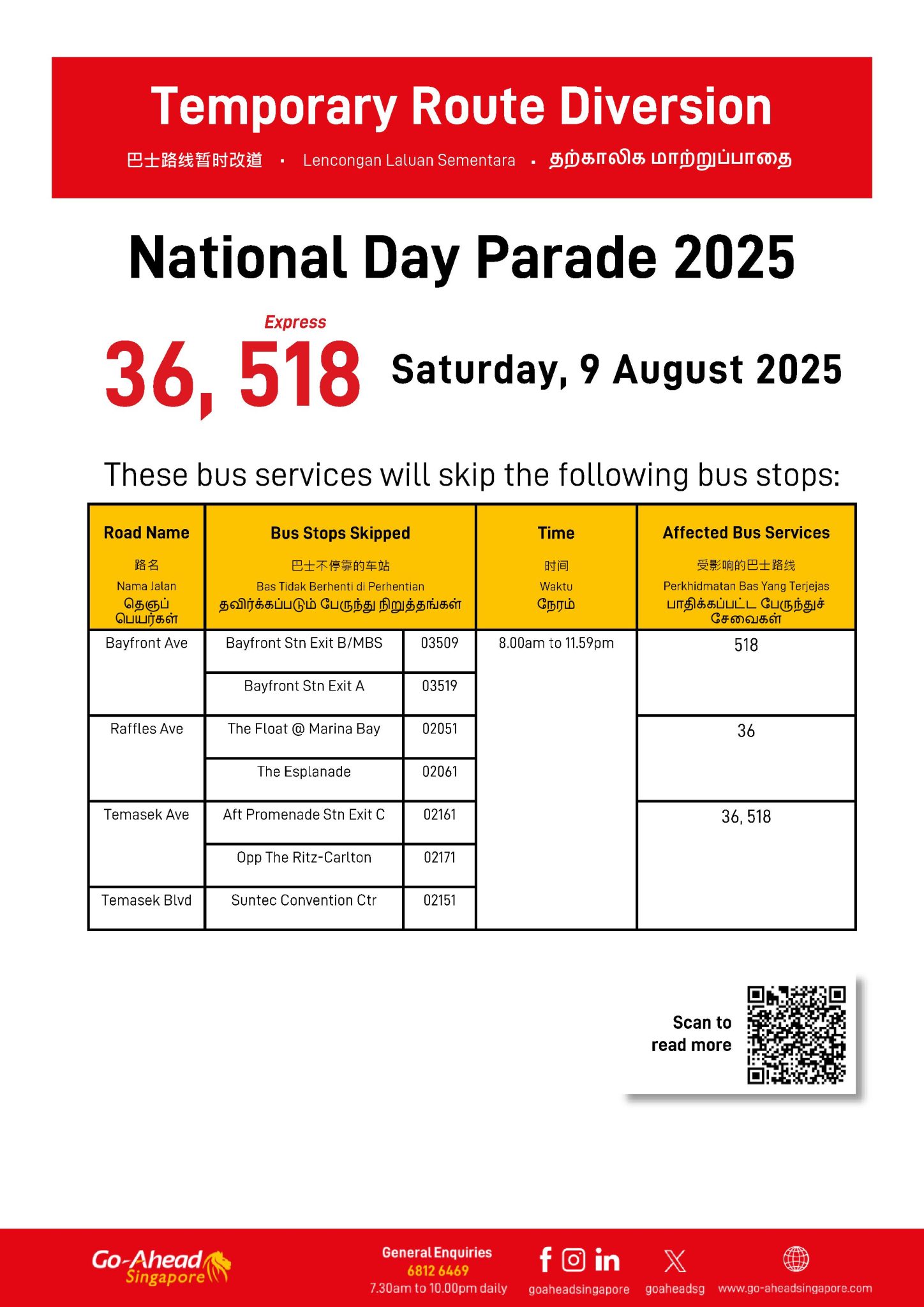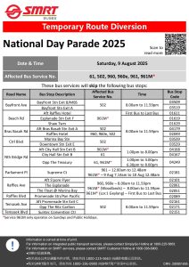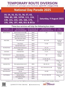 Road and lane closures for the National Day Parade 2025 will affect bus services in the city area.