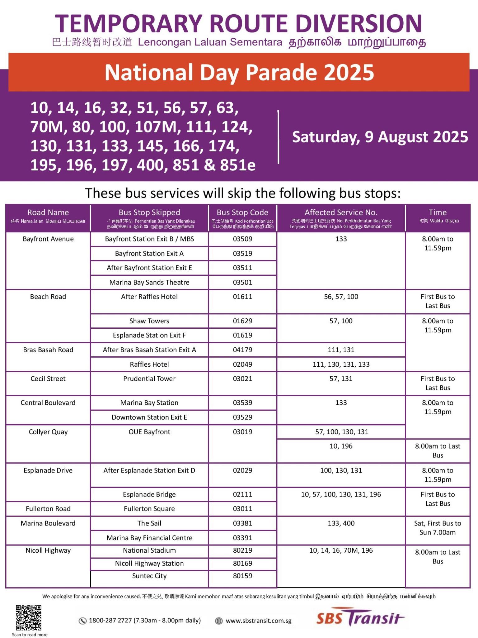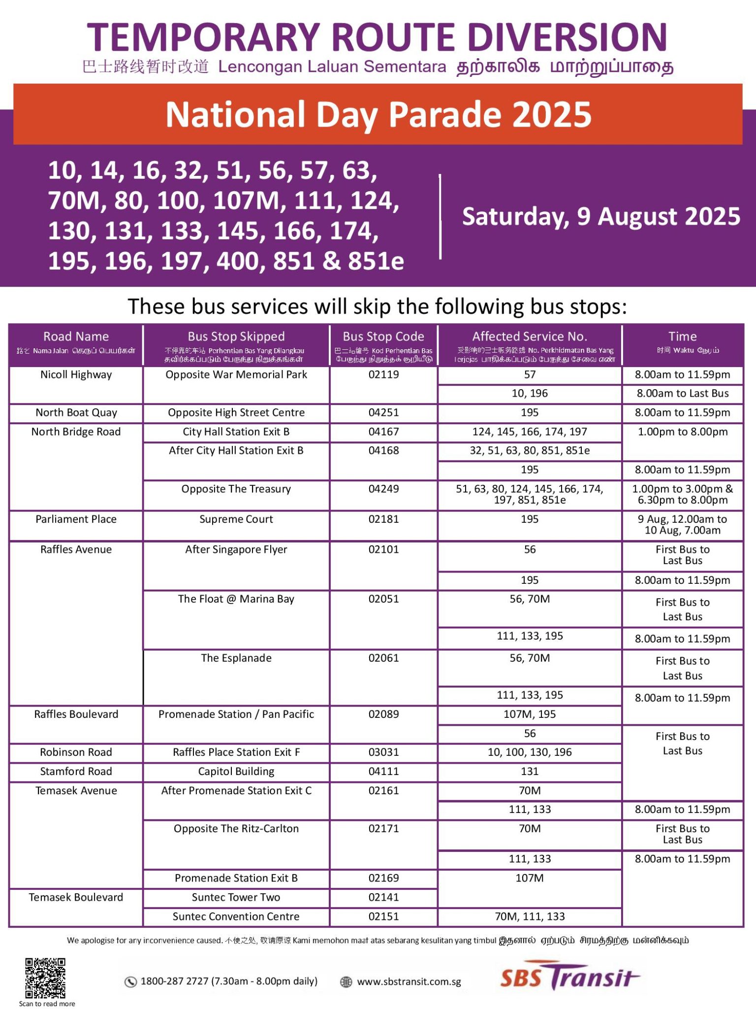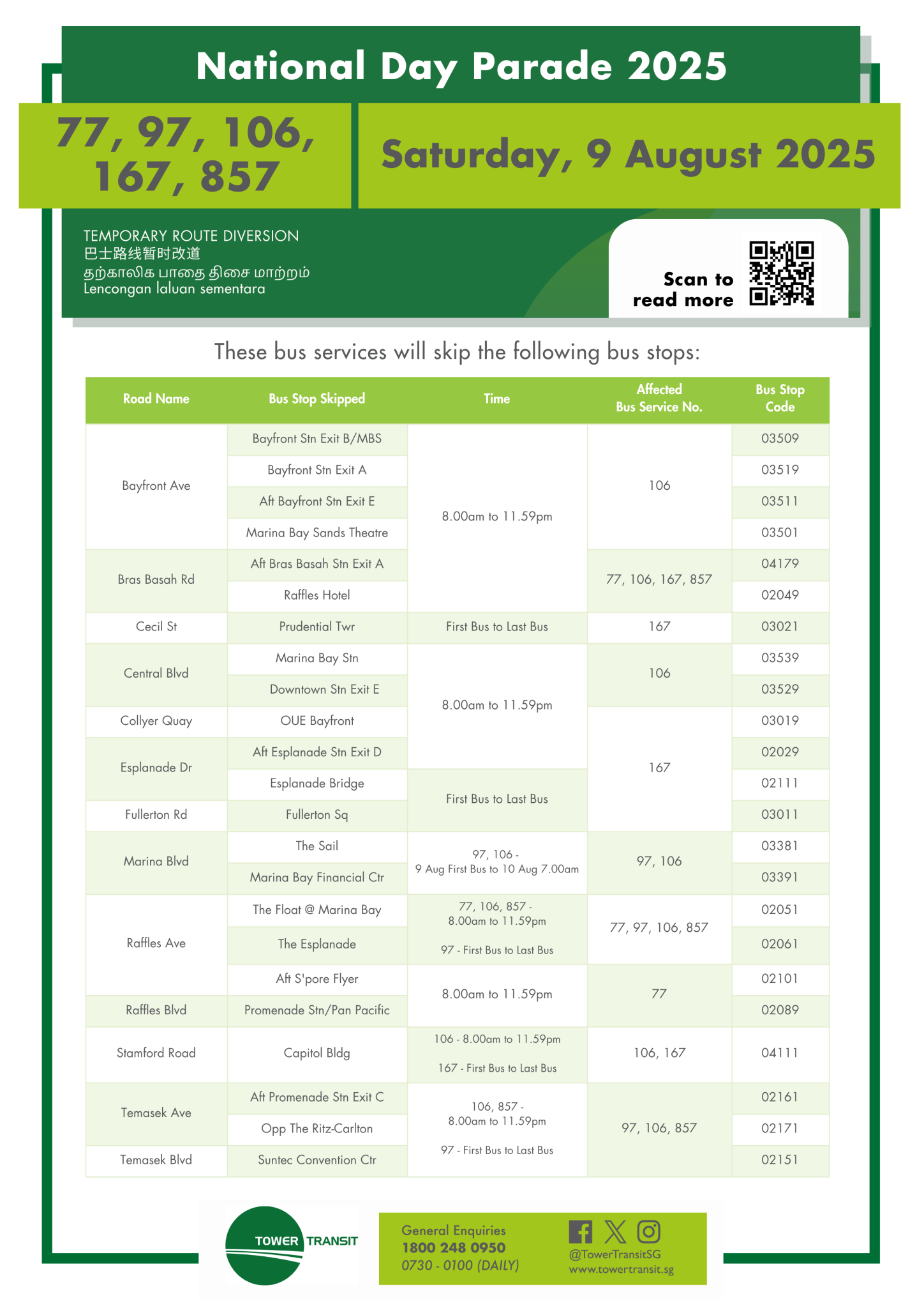 | Bus Stops Skipped for National Day Parade 2025 Saturday, 9 August 2025 First Bus – Last Bus |