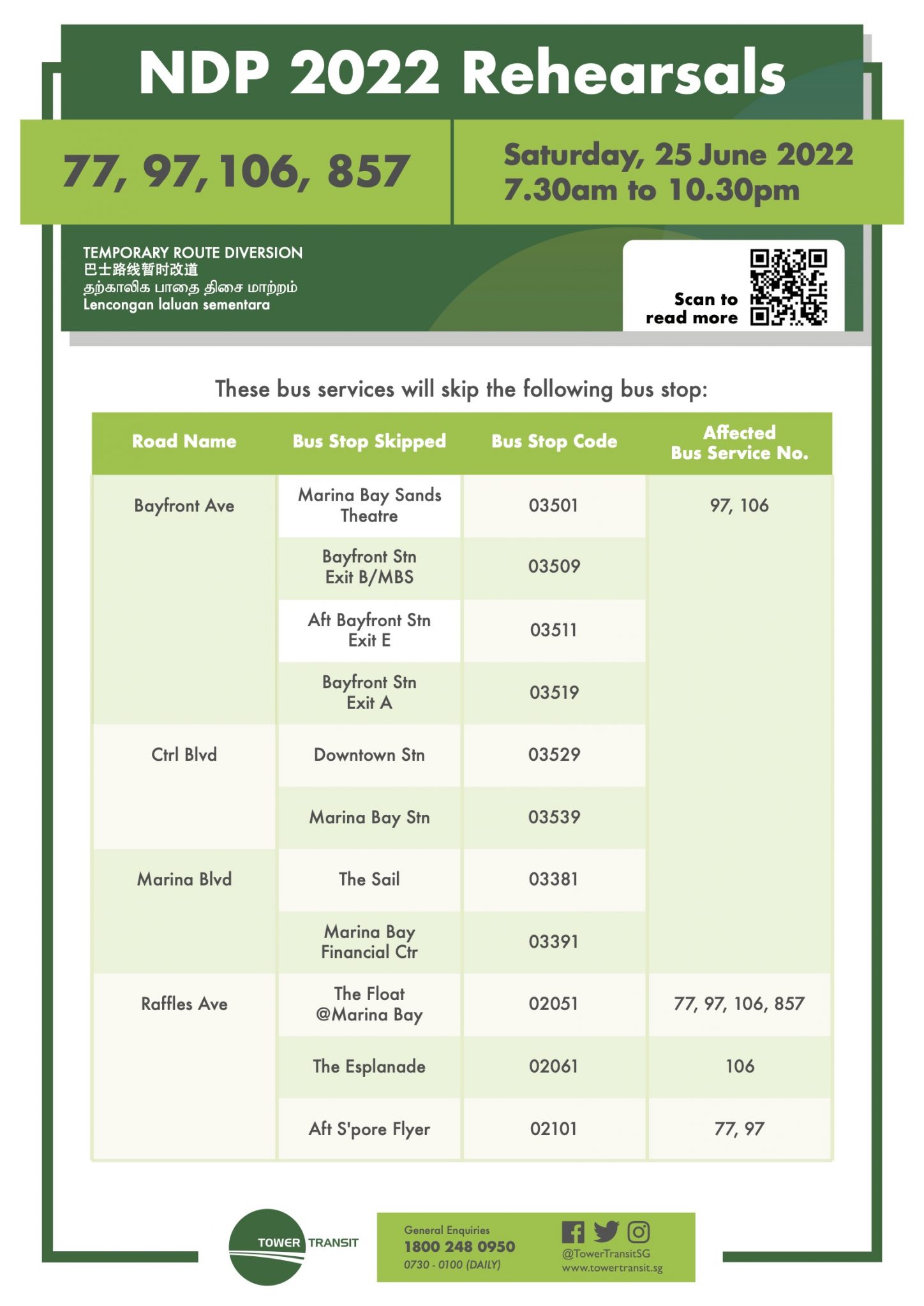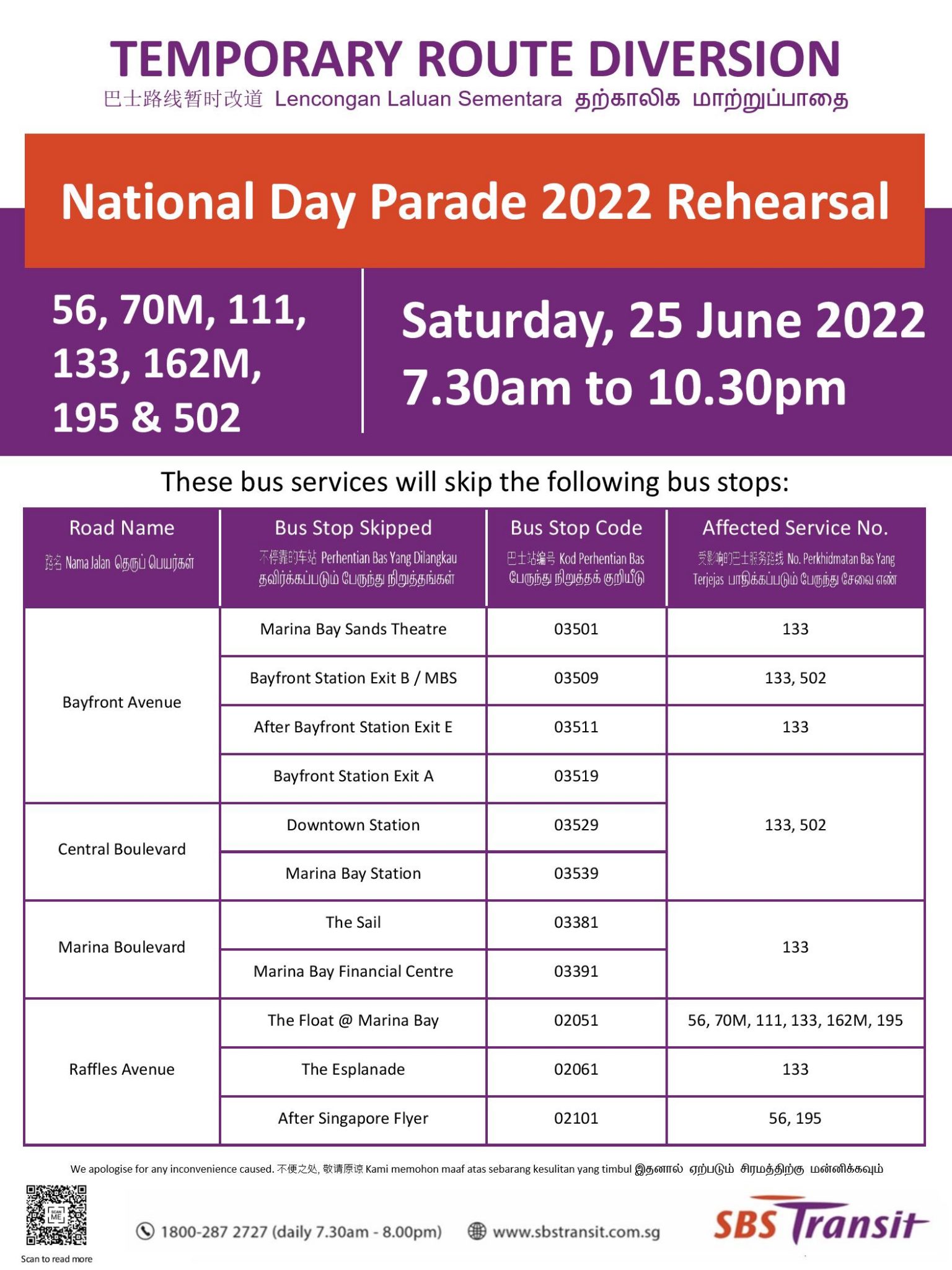Bus Service Diversion for National Day Parade 2022 Rehearsals (25 Jun)