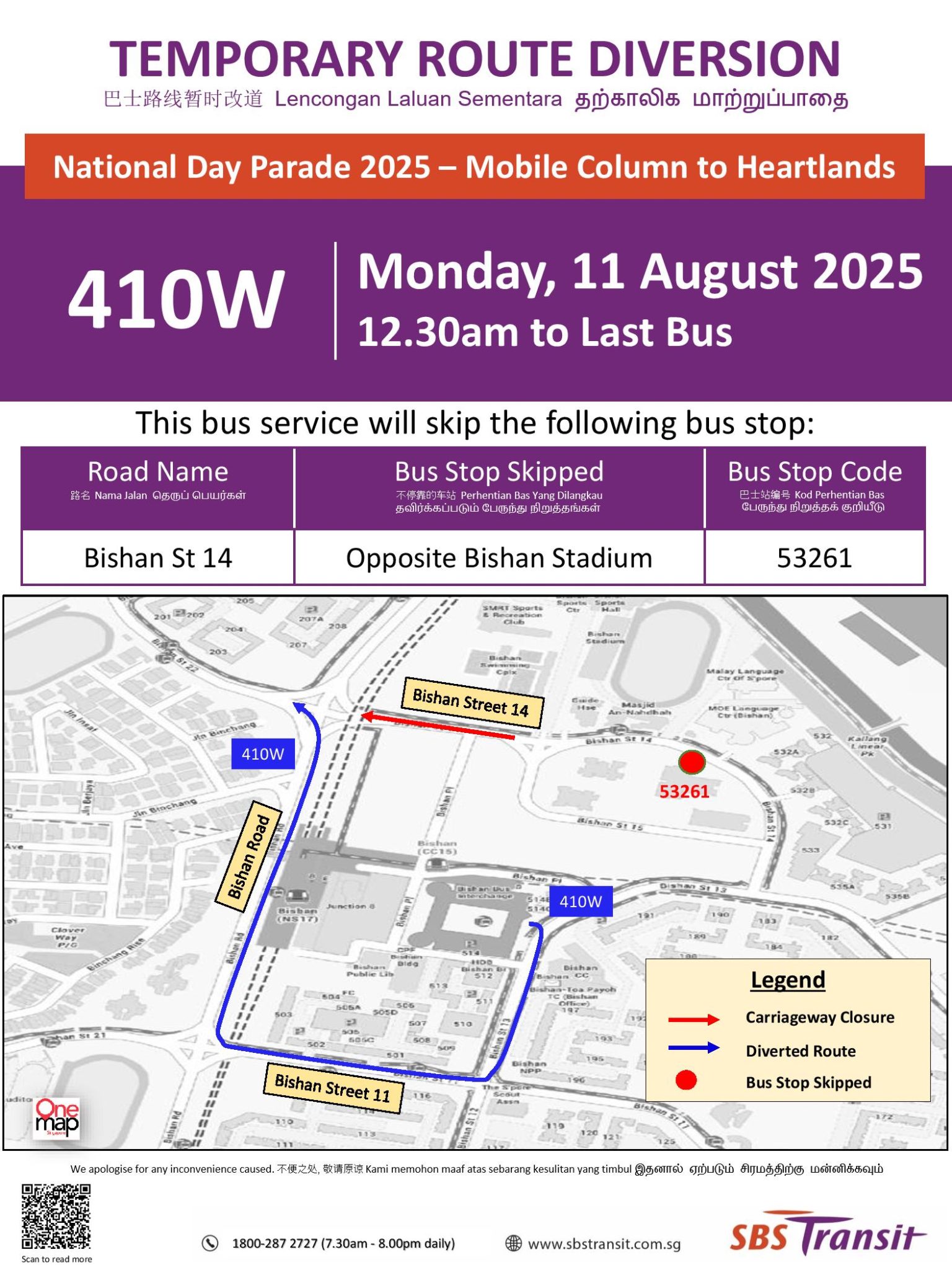| Bishan St 14 | 53261 | Opp Bishan Stadium | Mon 11 Aug 12.00am – Last Bus | 410W |