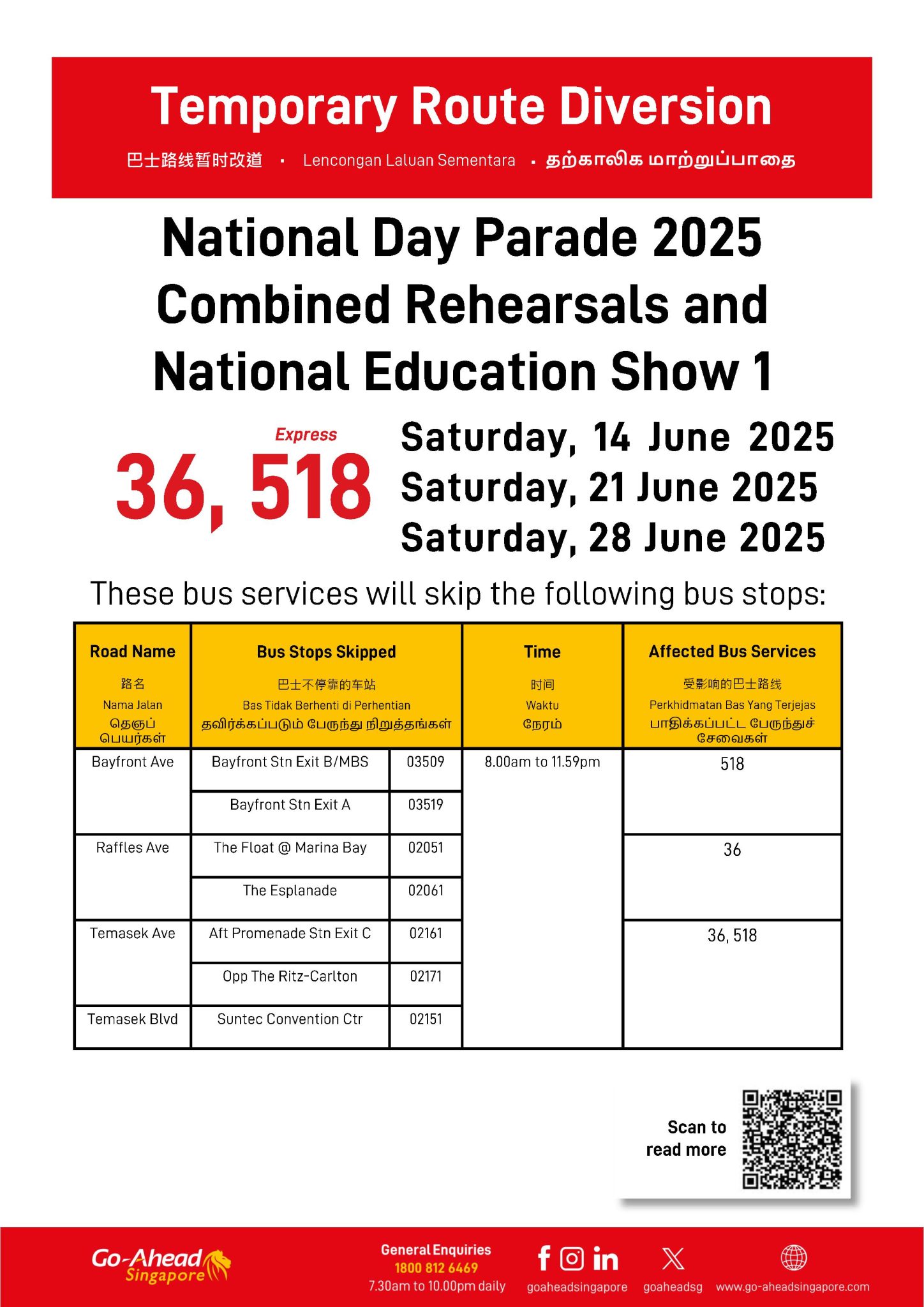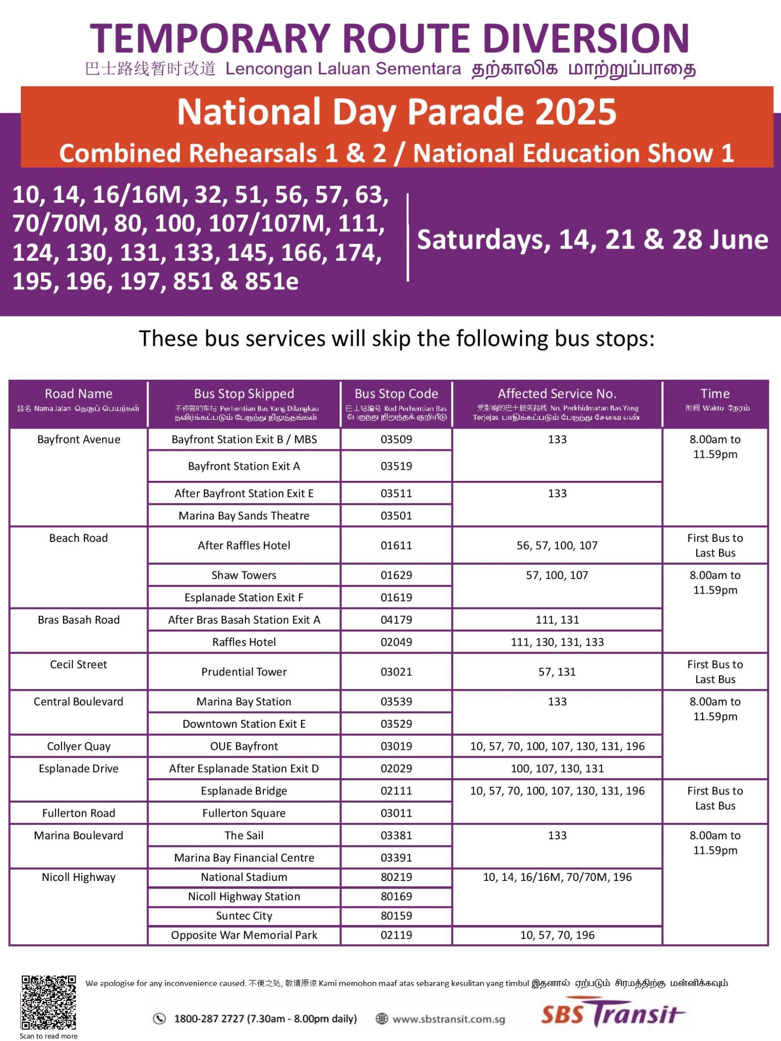 | Bus Stops Skipped for National Day Parade 2025 National Education Show 1 Saturday, 28 June 2025 First Bus – Last Bus |