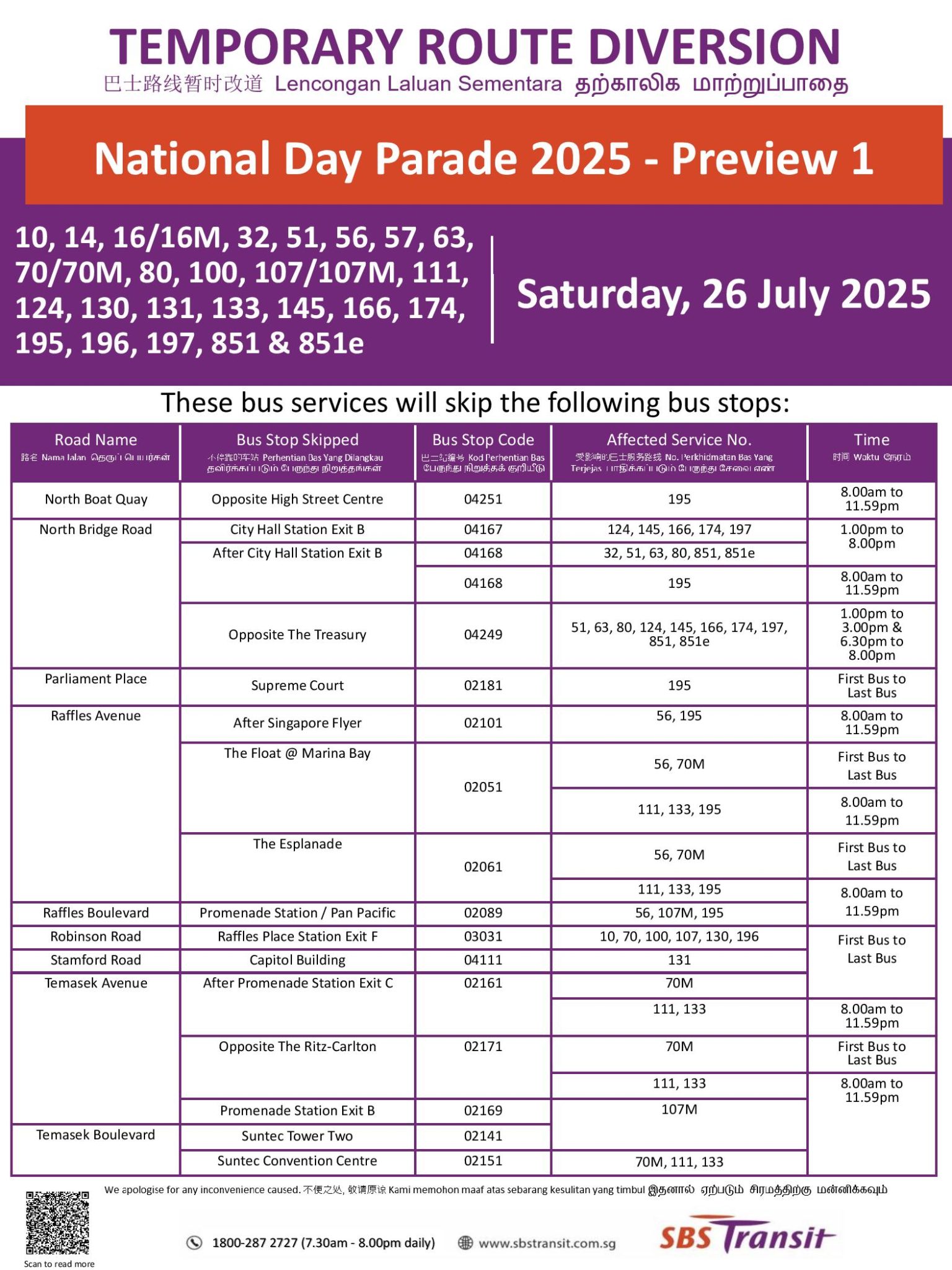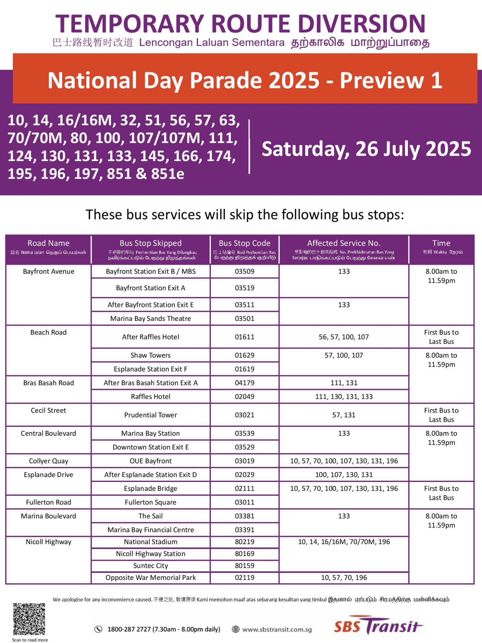 Road and lane closures for the National Day Parade 2025 Preview 1 will affect bus services in the city area.