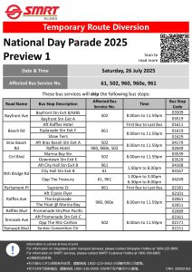 | Bus Stops Skipped for National Day Parade 2025 Preview 1 Saturday, 26 July 2025 First Bus – Last Bus |